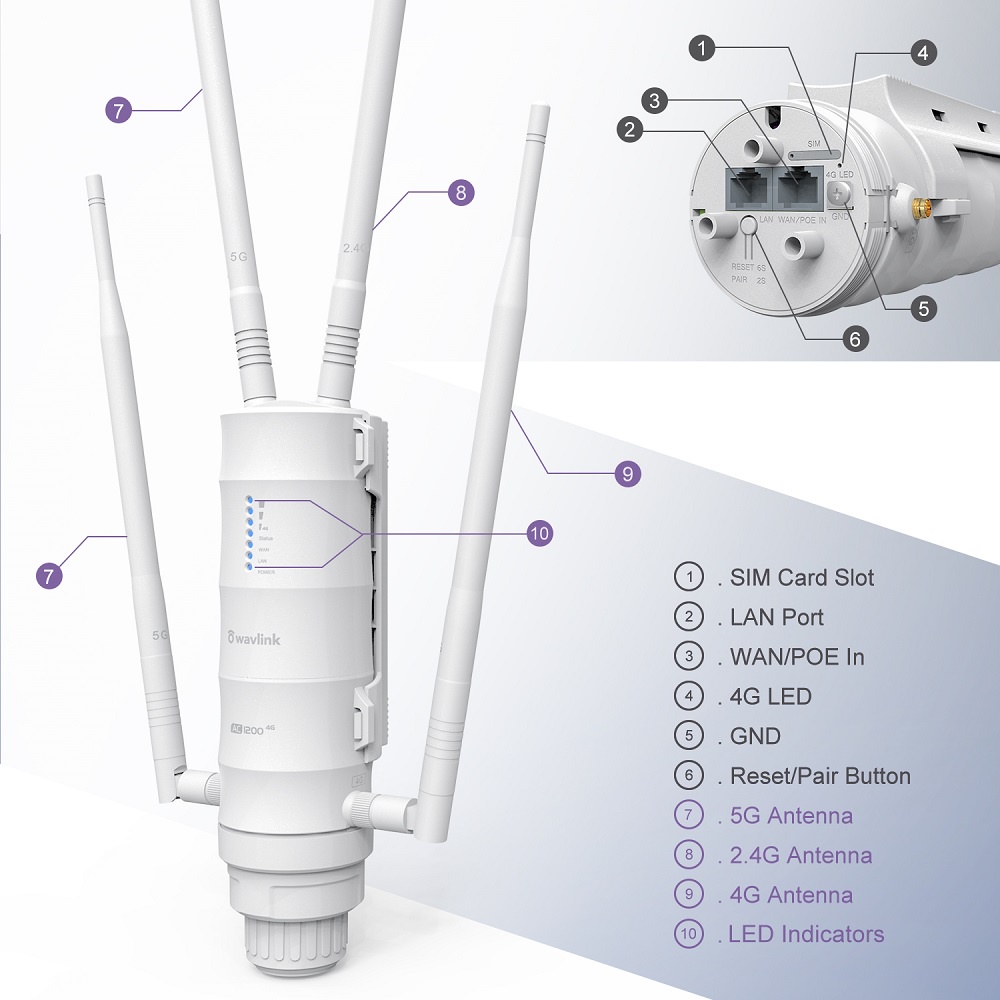 Wavlink AC1200 4G LTE Outdoor Wi-Fi Router Dual Band with SIM Card Slot Support Router/EasyMesh Router Mode