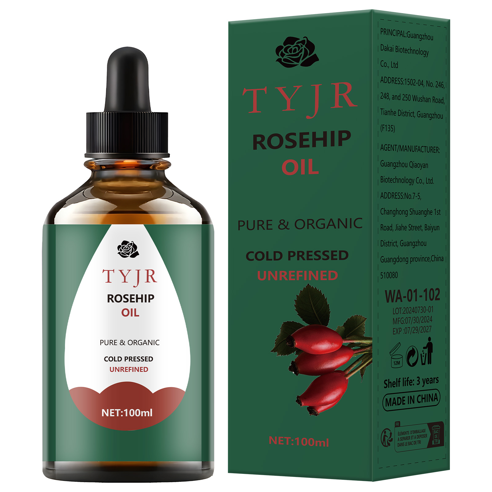 100% Pure, Cold Pressed, Unrefined Rosehip Seed Oil, Non-GMO, Hypoallergenic, for Face, Hair, and Nails.