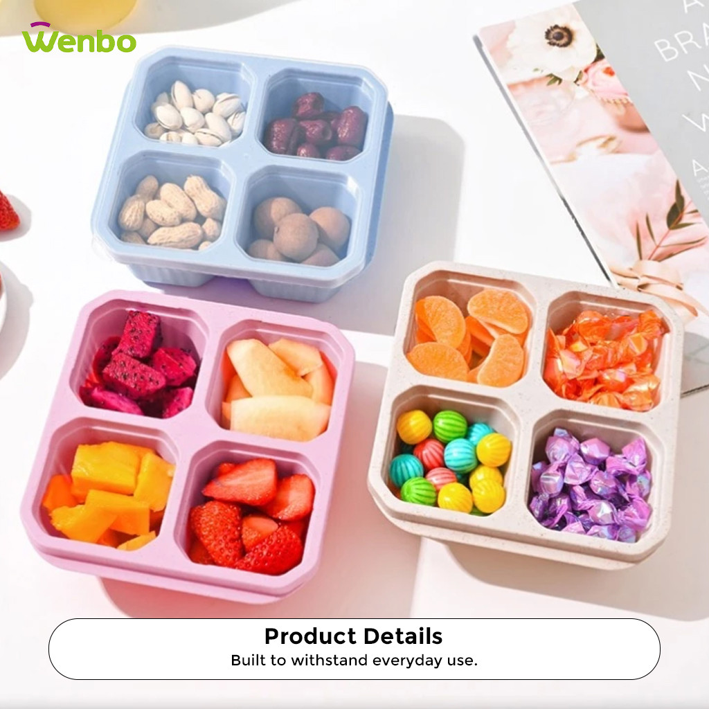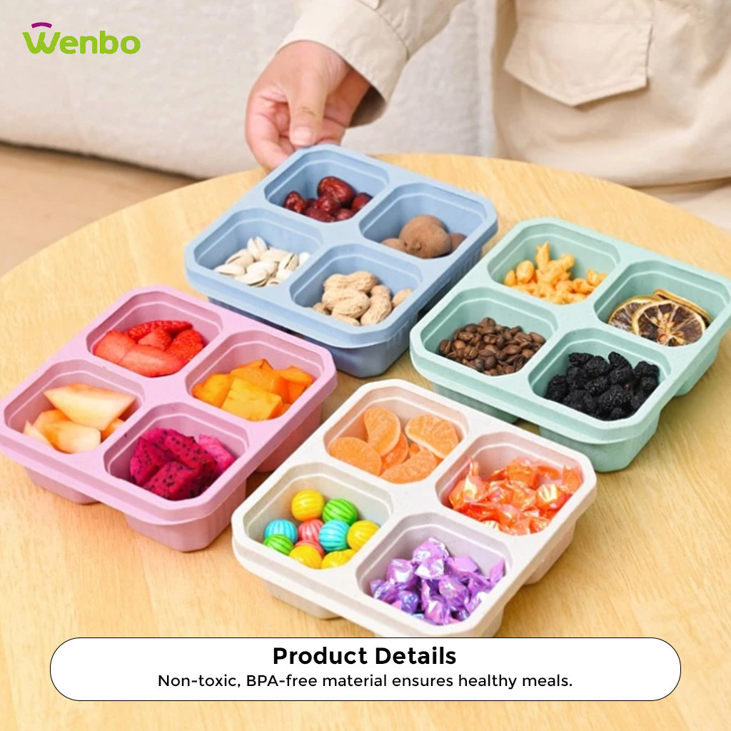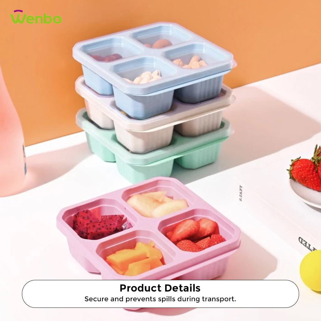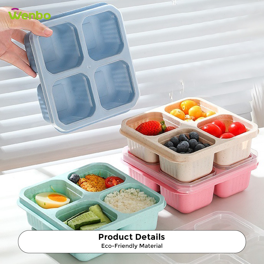 Wenbo Food Container With 4 Grid Compartment Wheat Straw Lunch Box Square Bento Portable Food Storage Container
