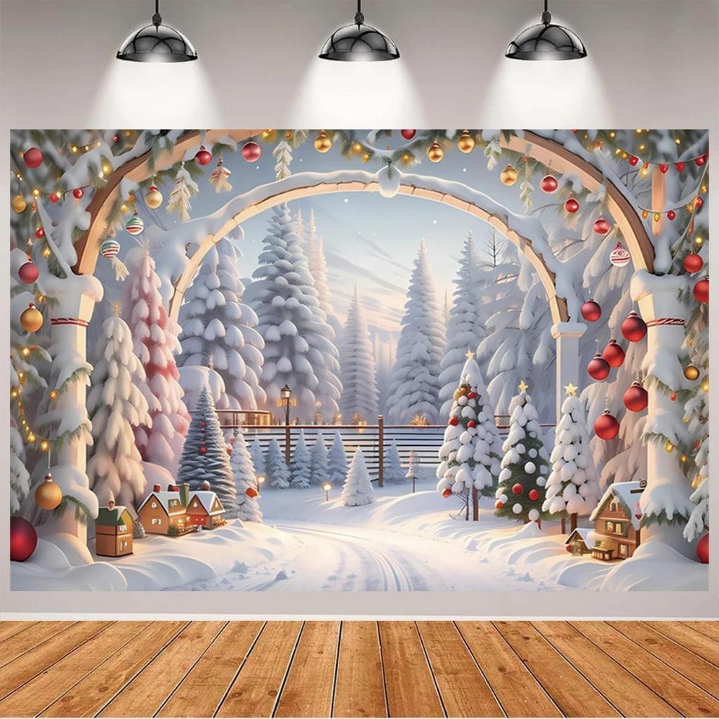 White Snow Christmas Tree Outside Door Christmas Backdrop Nature Scenery Tree Landscape Backdrop Snowy Christmas Trees Holiday Famliy Portrait Background Photo Booth Props