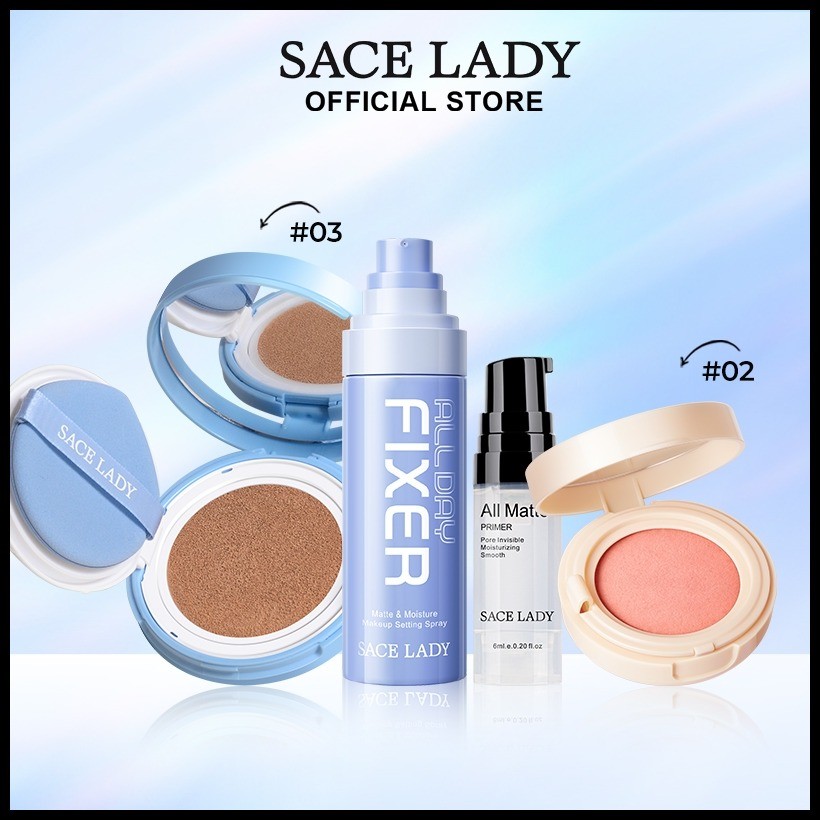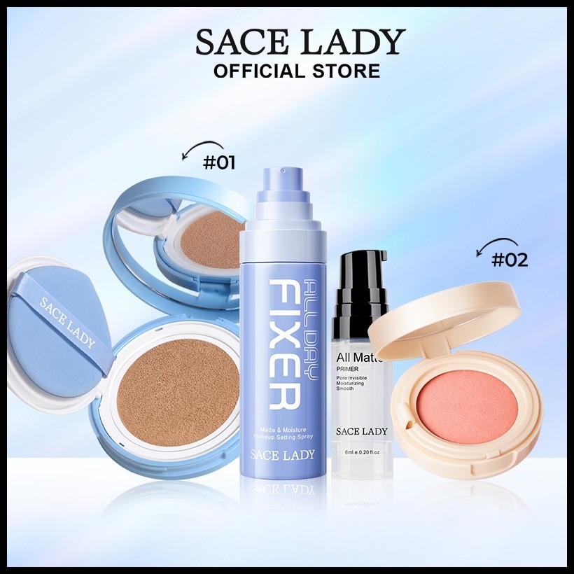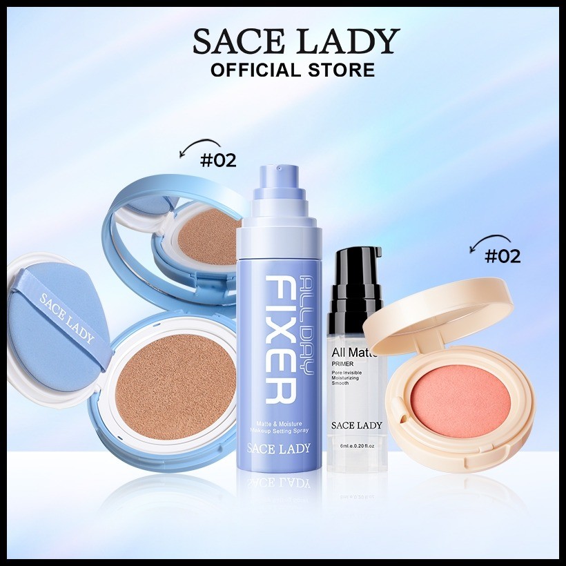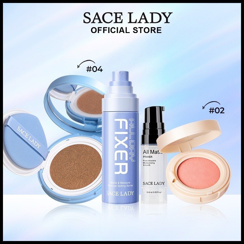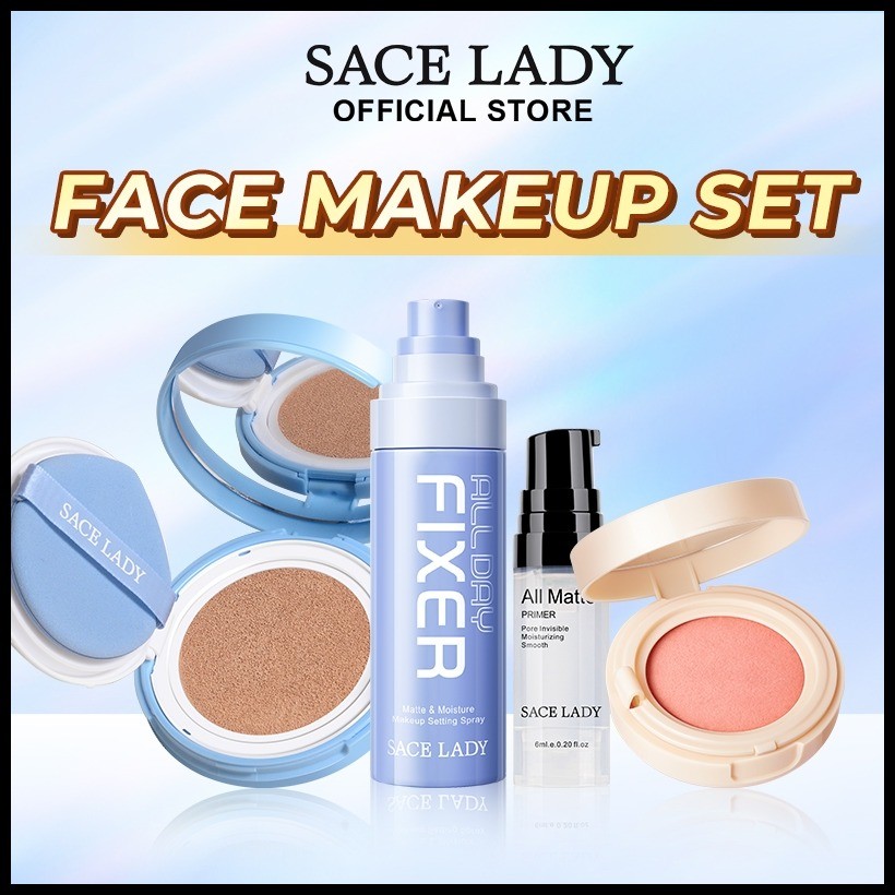 SACE LADY 4PCS Face Makeup Set Primer Setting Spray Cushion Foundation Blush Waterproof Long Lastin