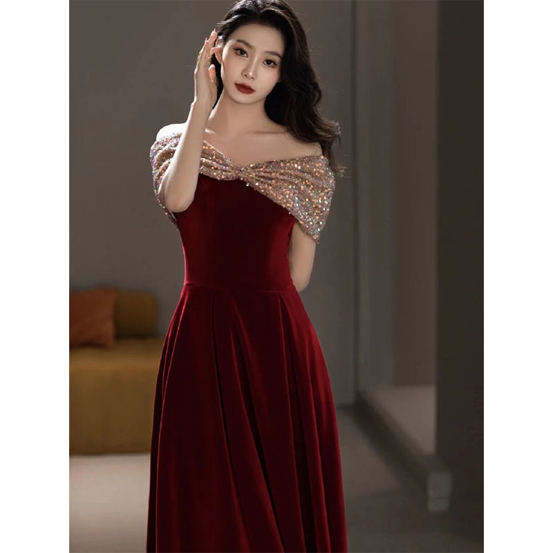Wine Red Cocktail Dress Bride's New Wedding Evening Dress Female Long Maxi Dress