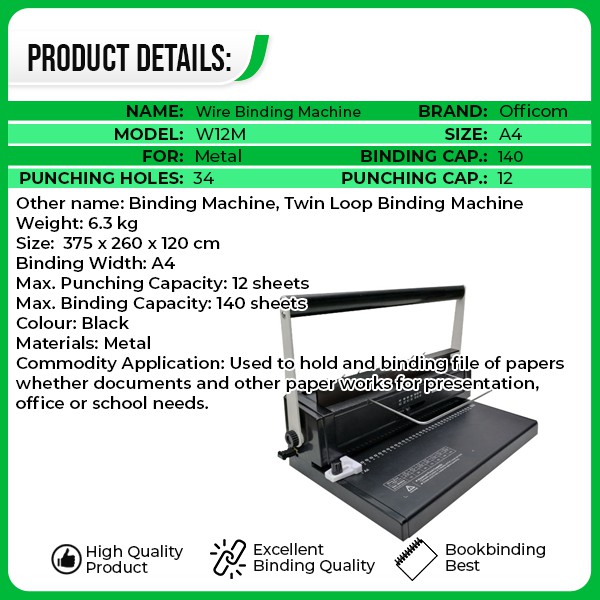 Officom W12M Wire Binding Machine 3:1 Pitch Double Loop Wire Binder Machine A4 Size