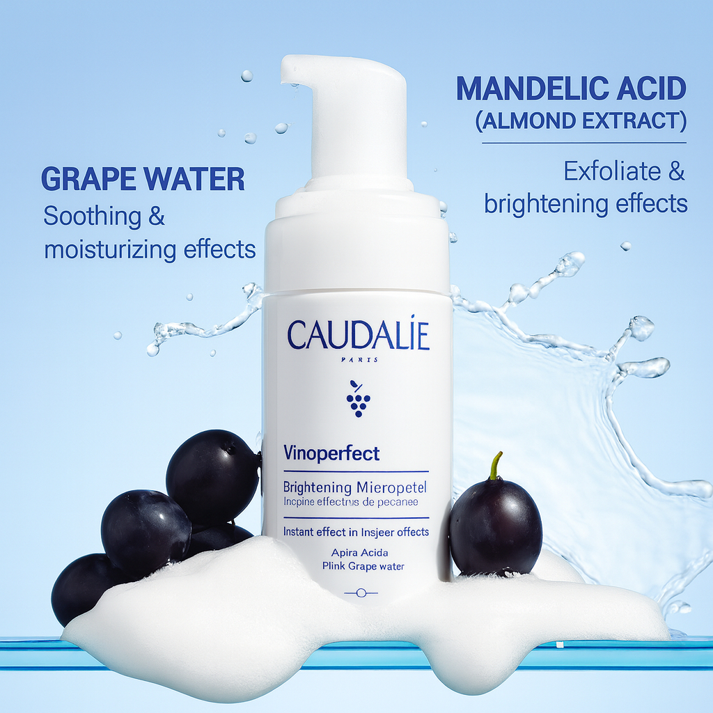 CAUDALIE VINOPERFECT BRIGHTENING FOAM CLEANSER 100ML, DAILY GENTLE EXFOLIATING FOAM WASH FOR CLEAR & RADIANT SKIN