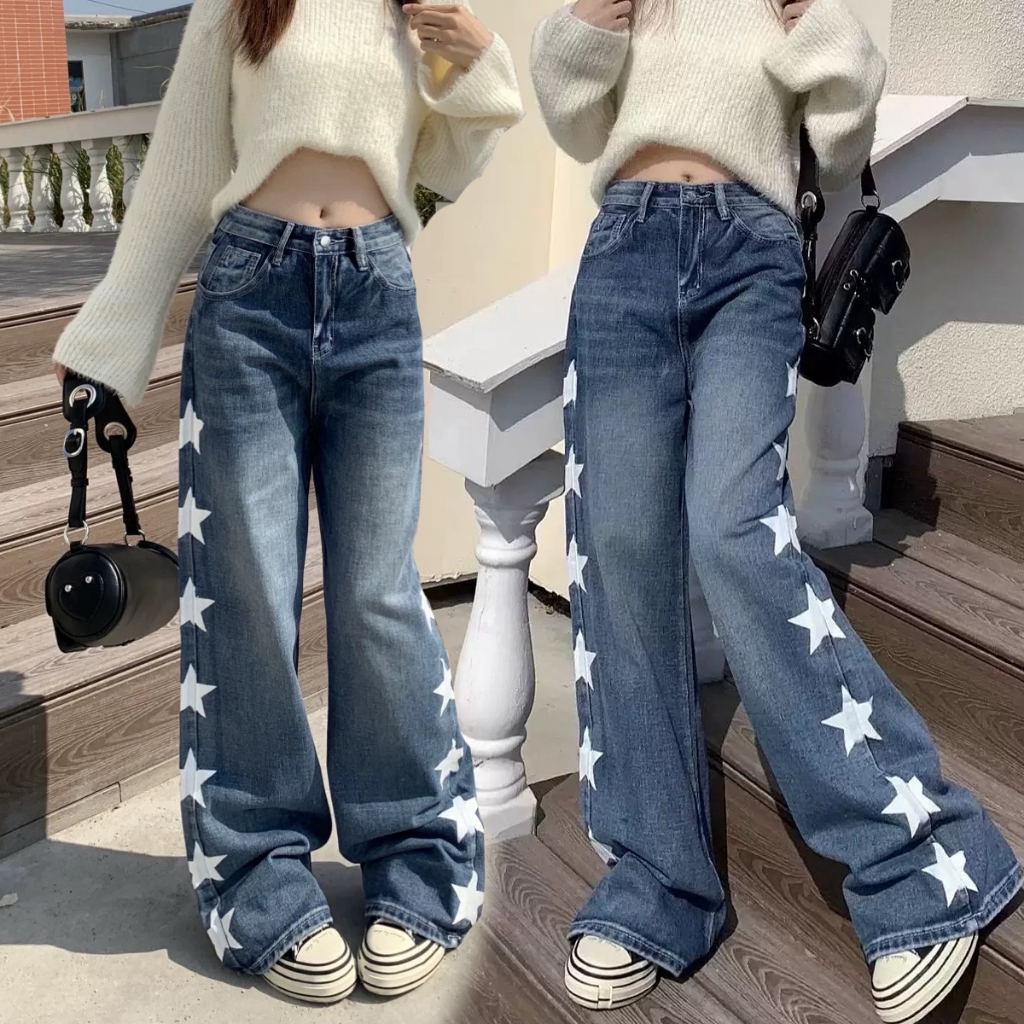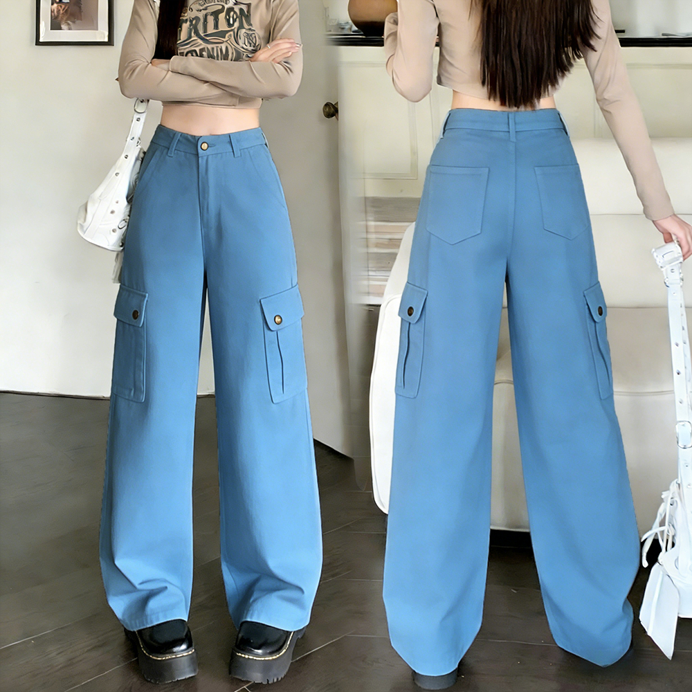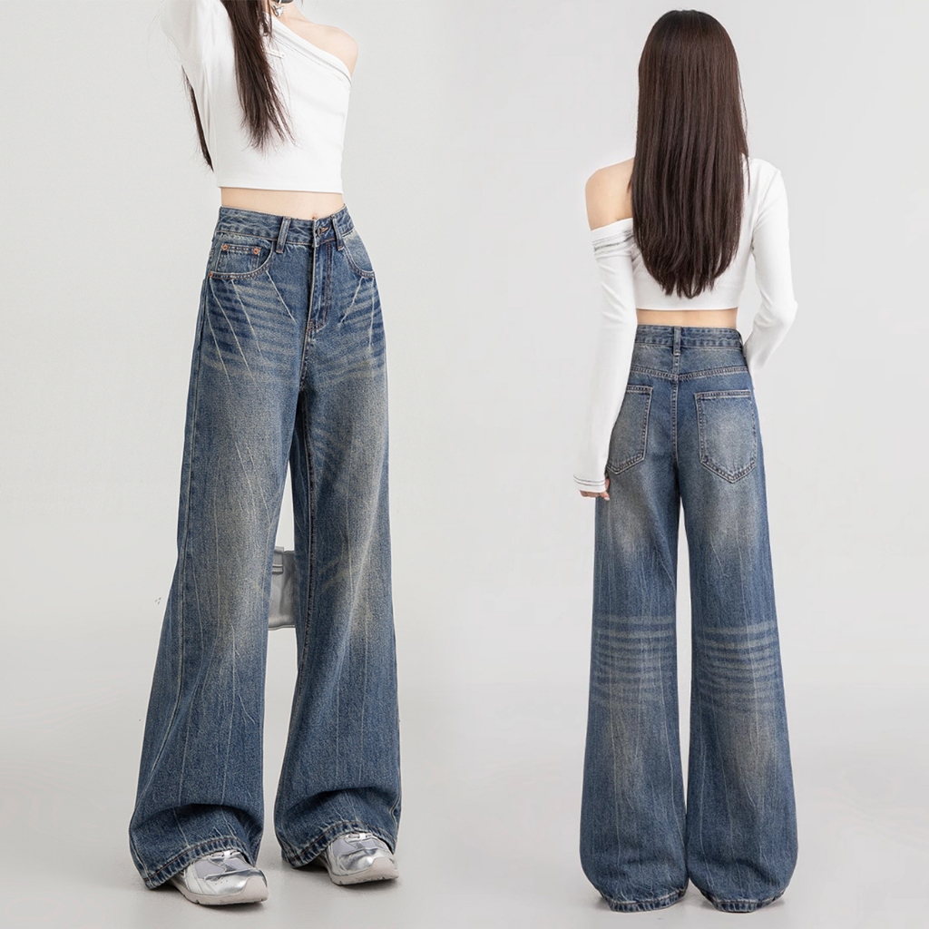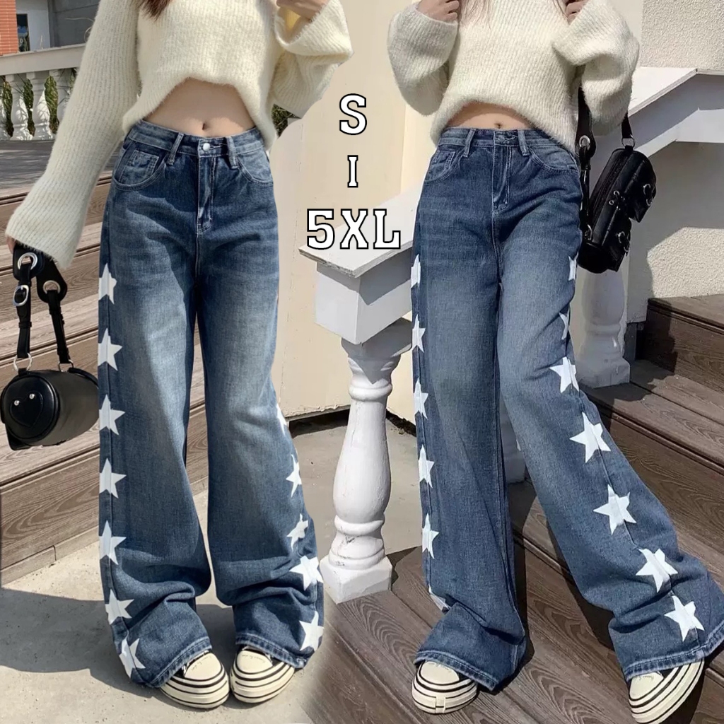 PLUE SIZE~Long jeans blue denim straight wide leg loose Korean style highwaist casual long pants HOT