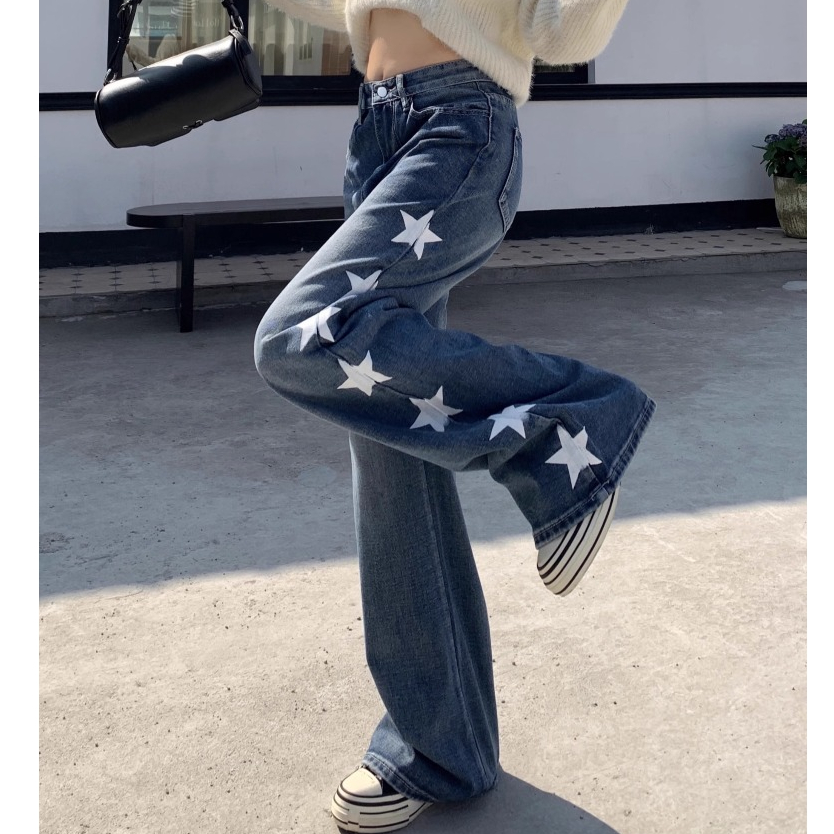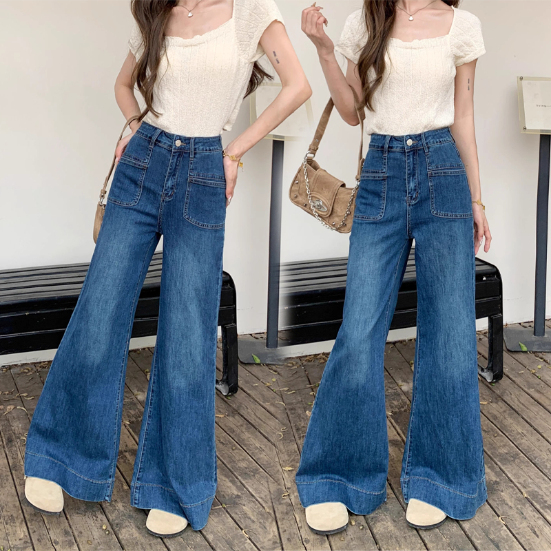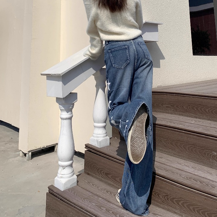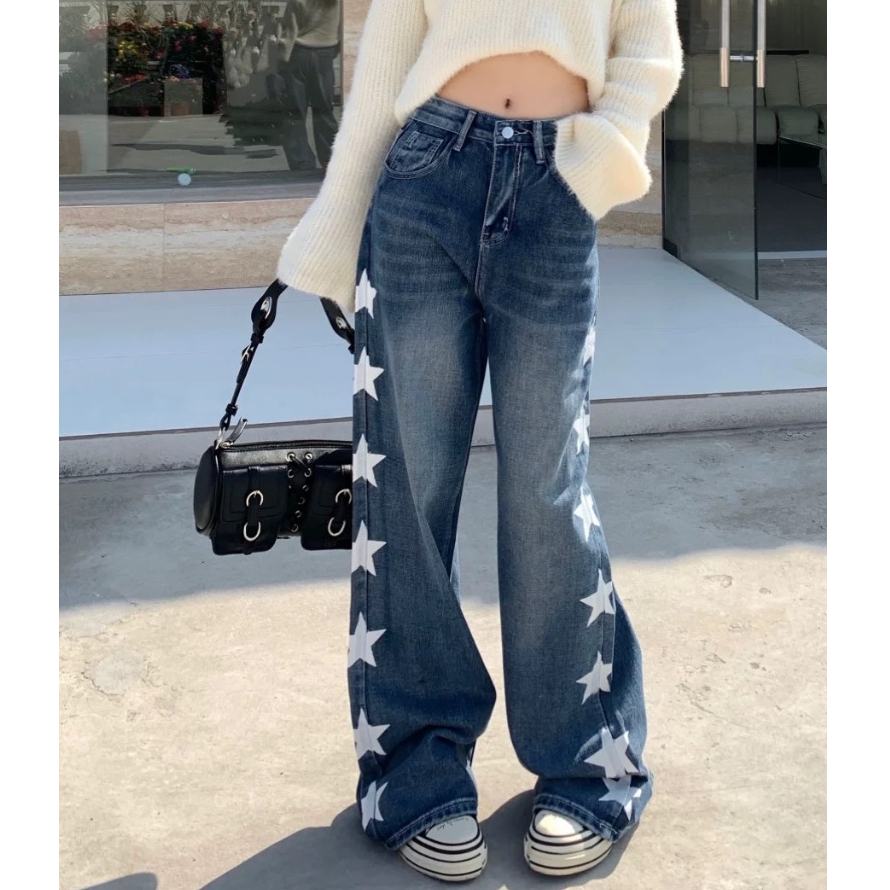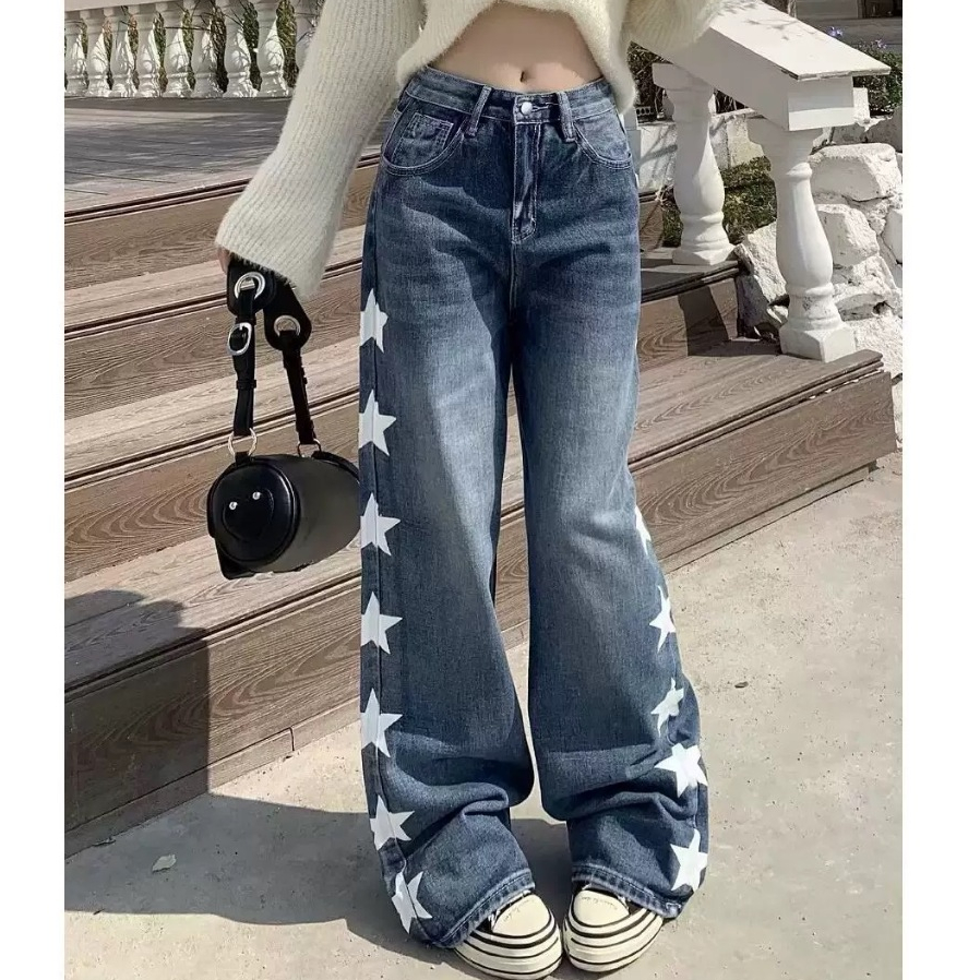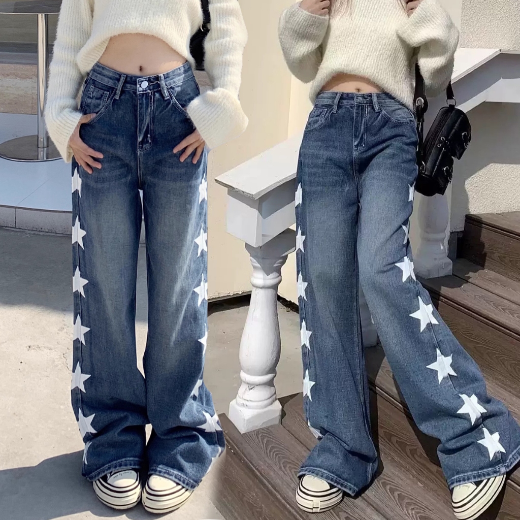 PLUE SIZE~Long jeans blue denim straight wide leg loose Korean style highwaist casual long pants HOT