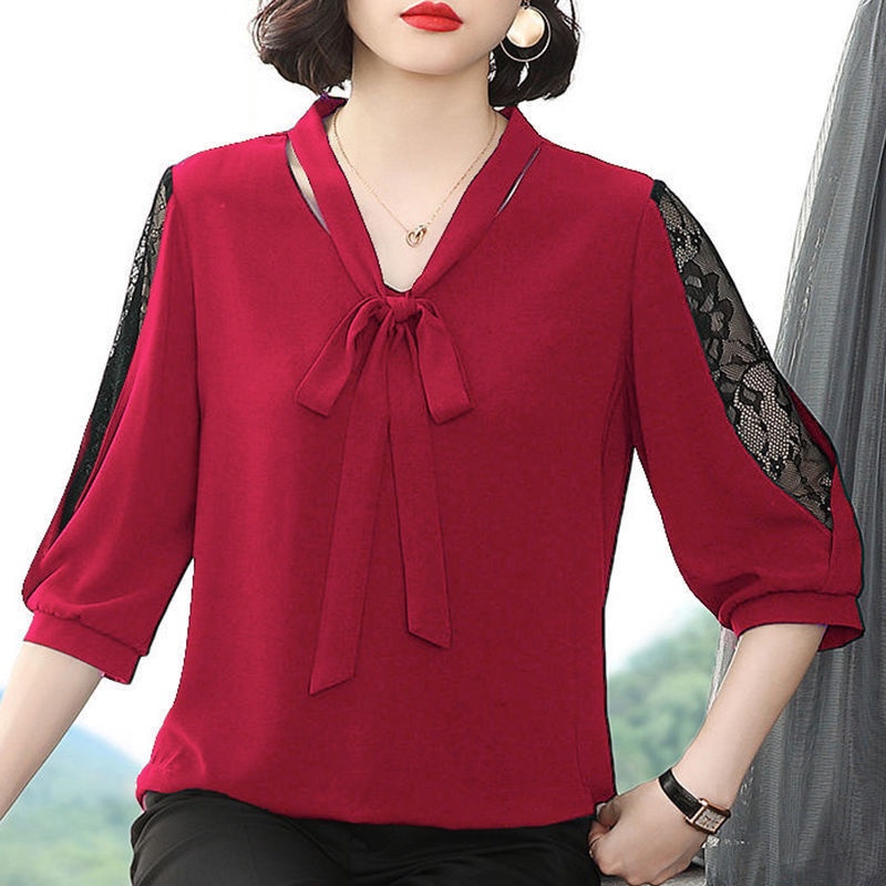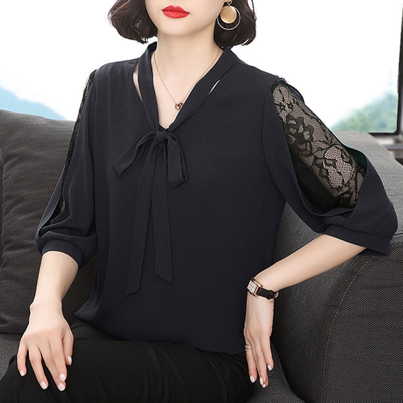Women's Plus Size Office Blouses With Ties Korean Style 3/4 Sleeves Lapel Shirts Lace Patchwork Turn-down Collar Blouses Ladies' Work Daily Wear Formal Office Tops Chiffon Blouses
