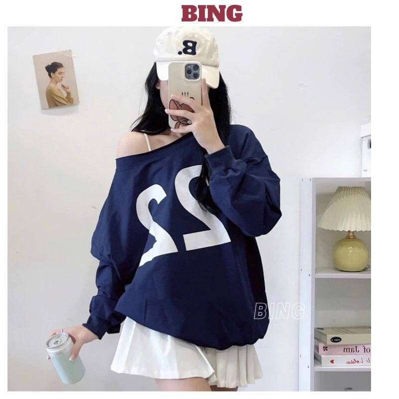 Women's off-the-shoulder shirt with oversize number print, very cute street-style loose t-shirt - BING