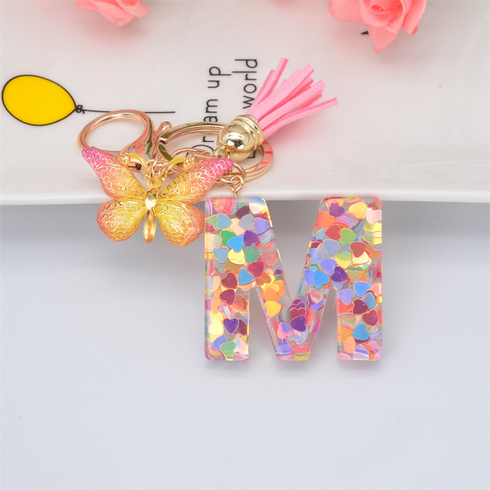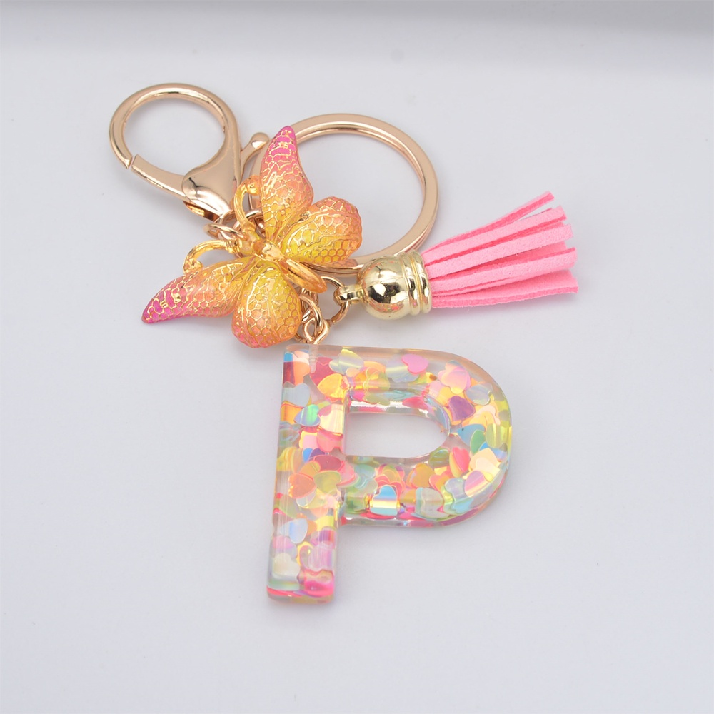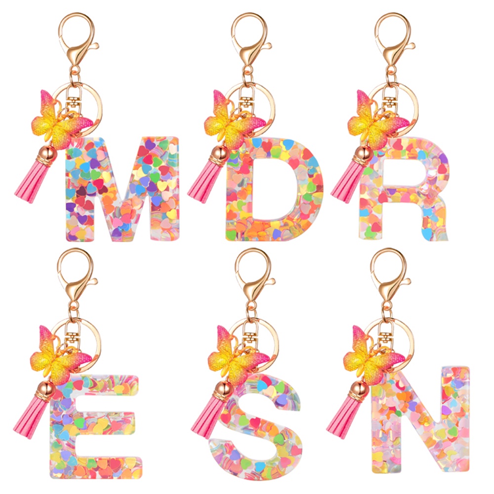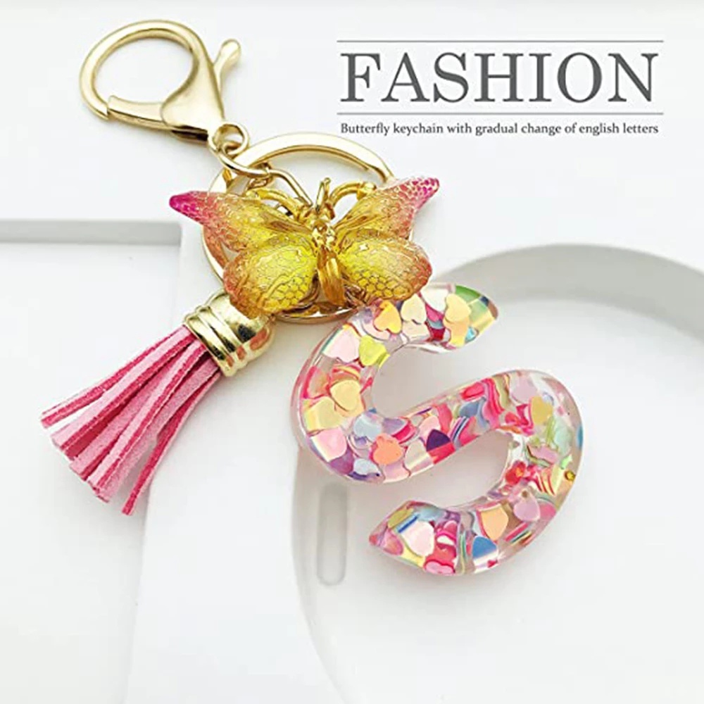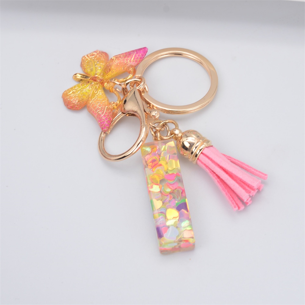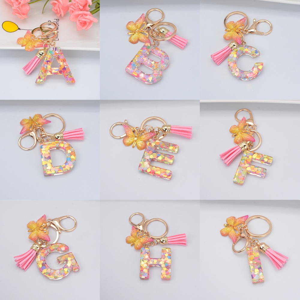 Women Colorful Sequin Filled A To Z Initial Letter Keychain Pink Sparkle Butterfly Tassel Alphabet Keyring For Purse Handbags Car Keys Decor