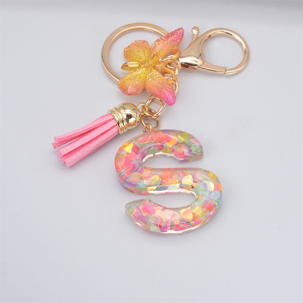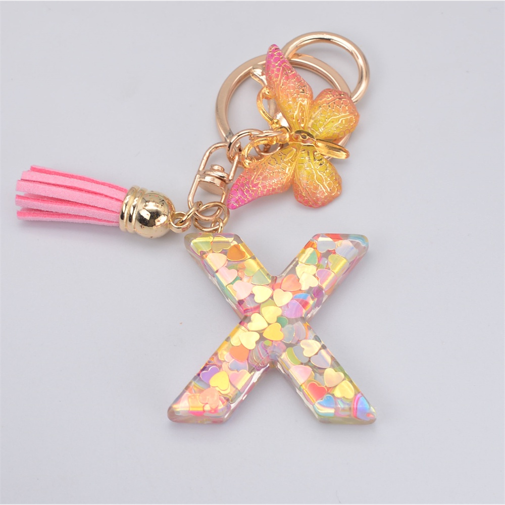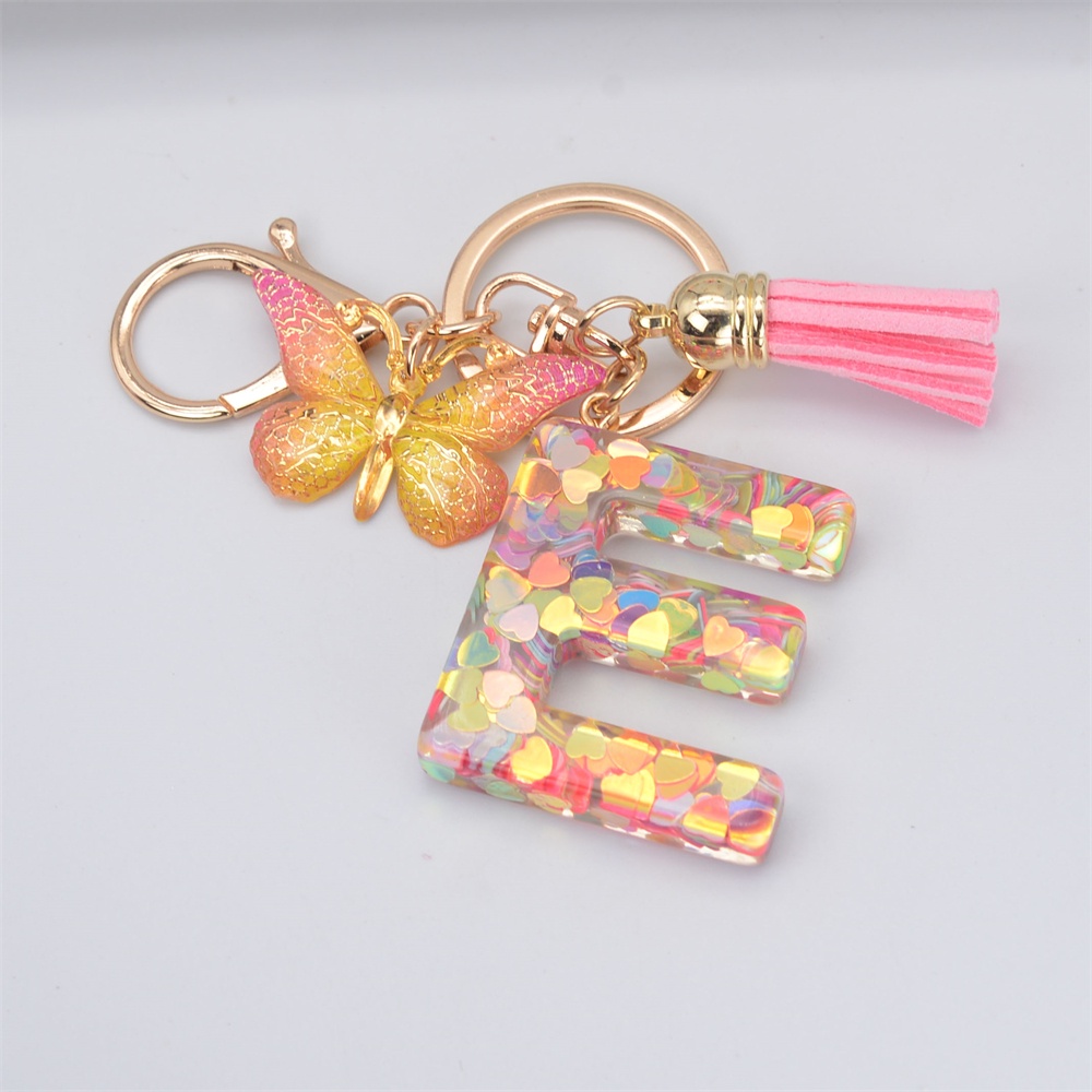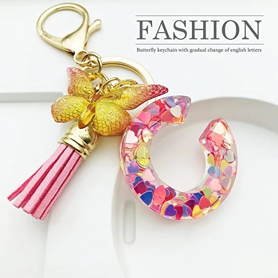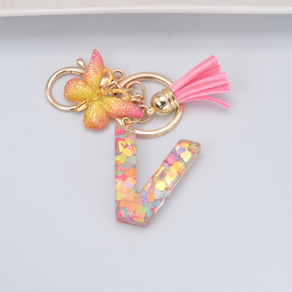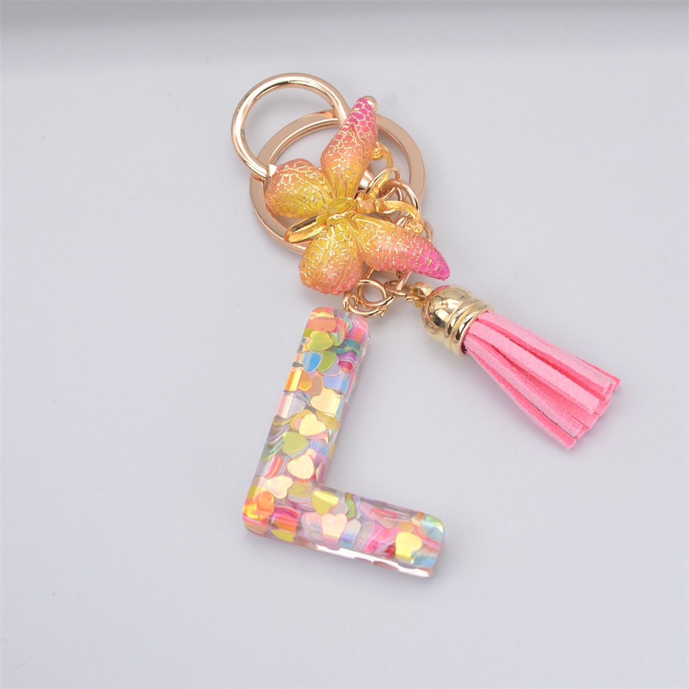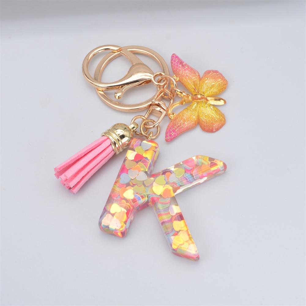 Women Colorful Sequin Filled A To Z Initial Letter Keychain Pink Sparkle Butterfly Tassel Alphabet Keyring For Purse Handbags Car Keys Decor