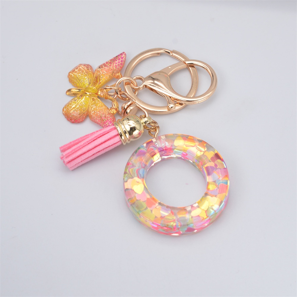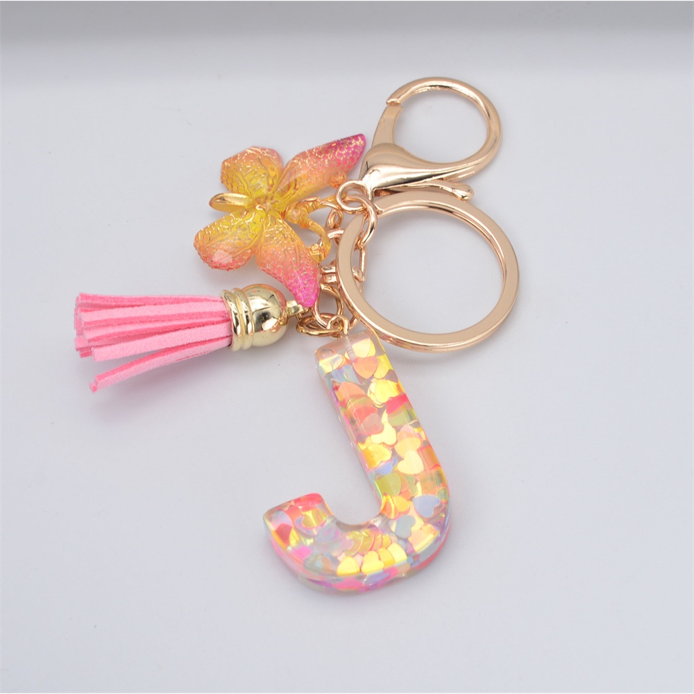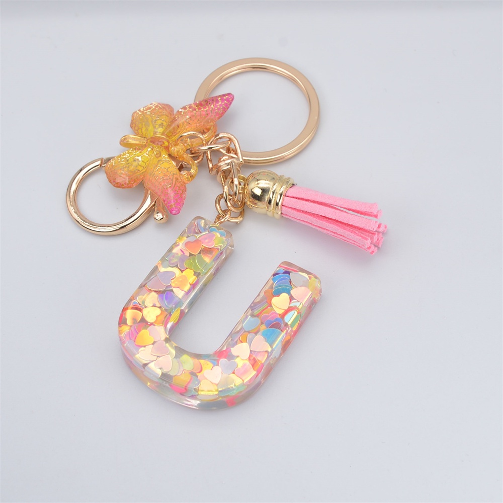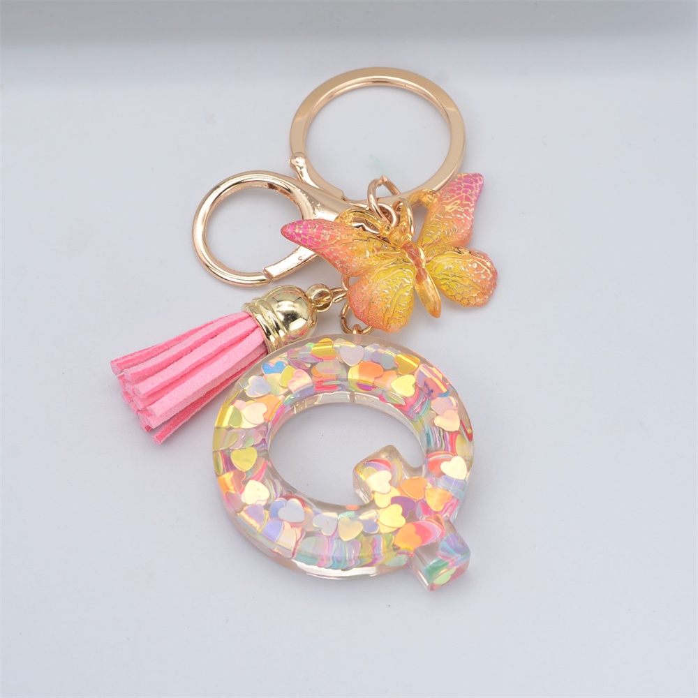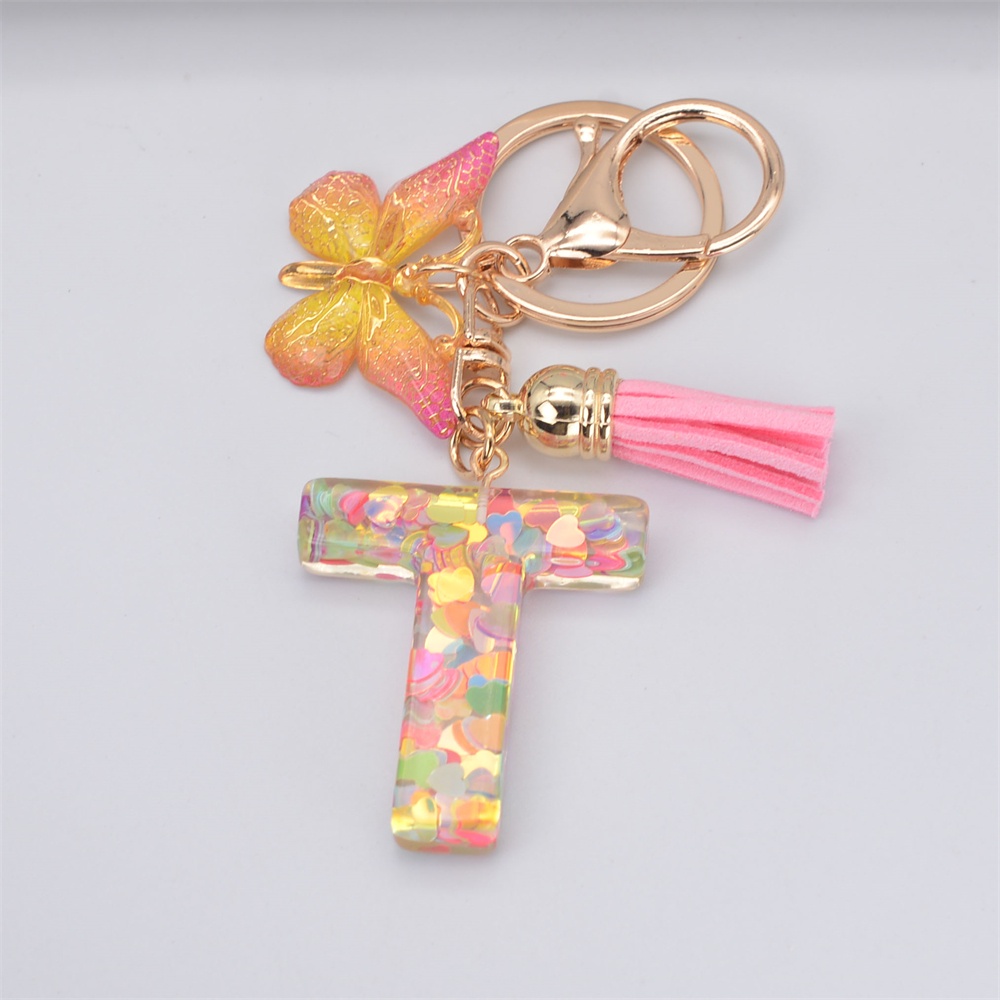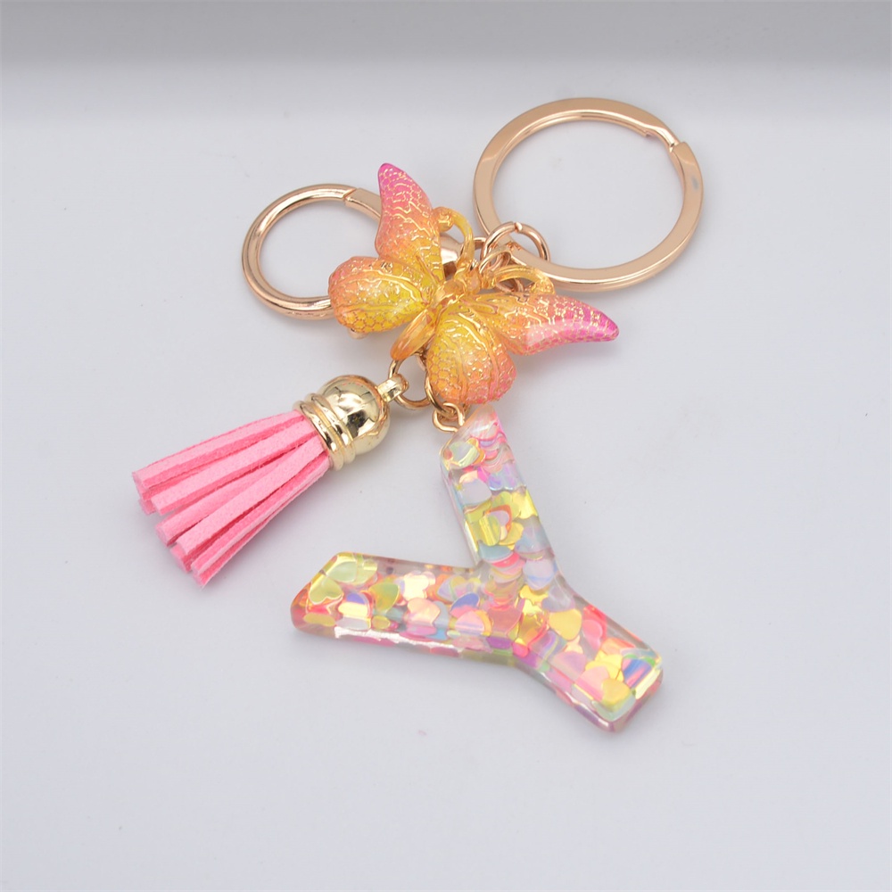 Women Colorful Sequin Filled A To Z Initial Letter Keychain Pink Sparkle Butterfly Tassel Alphabet Keyring For Purse Handbags Car Keys Decor