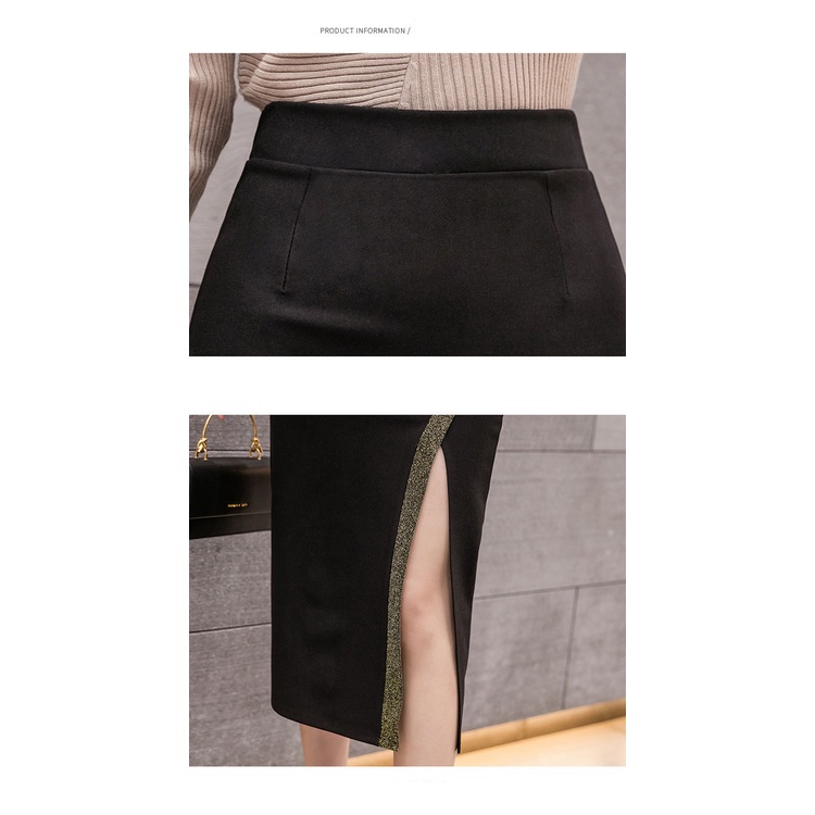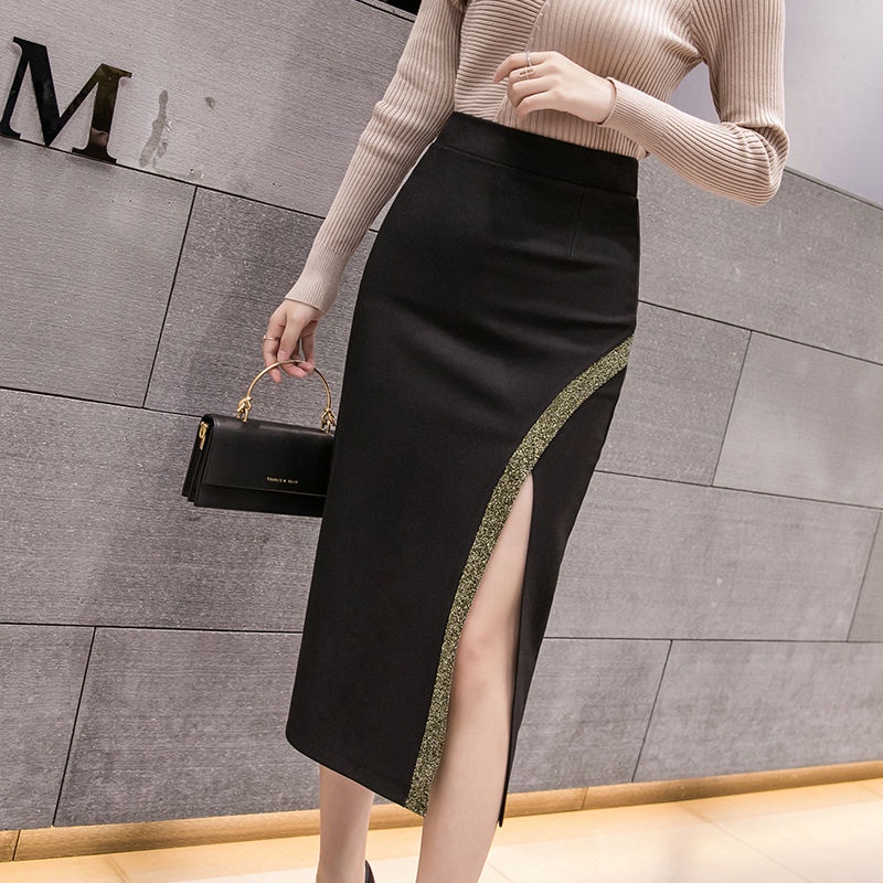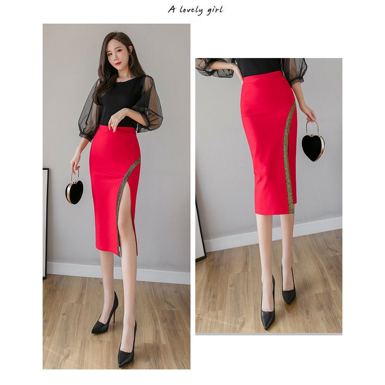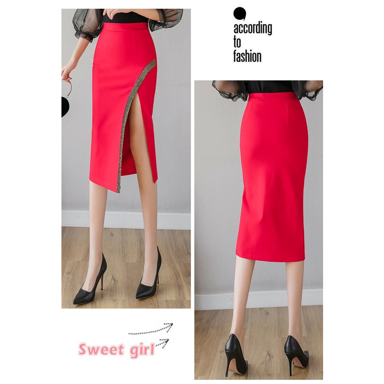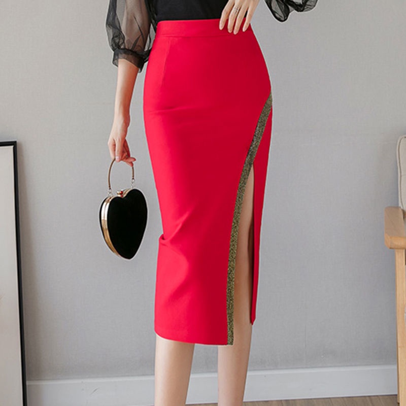 Women Elegant Skirts Mid Length High Waist Split Office Skirt