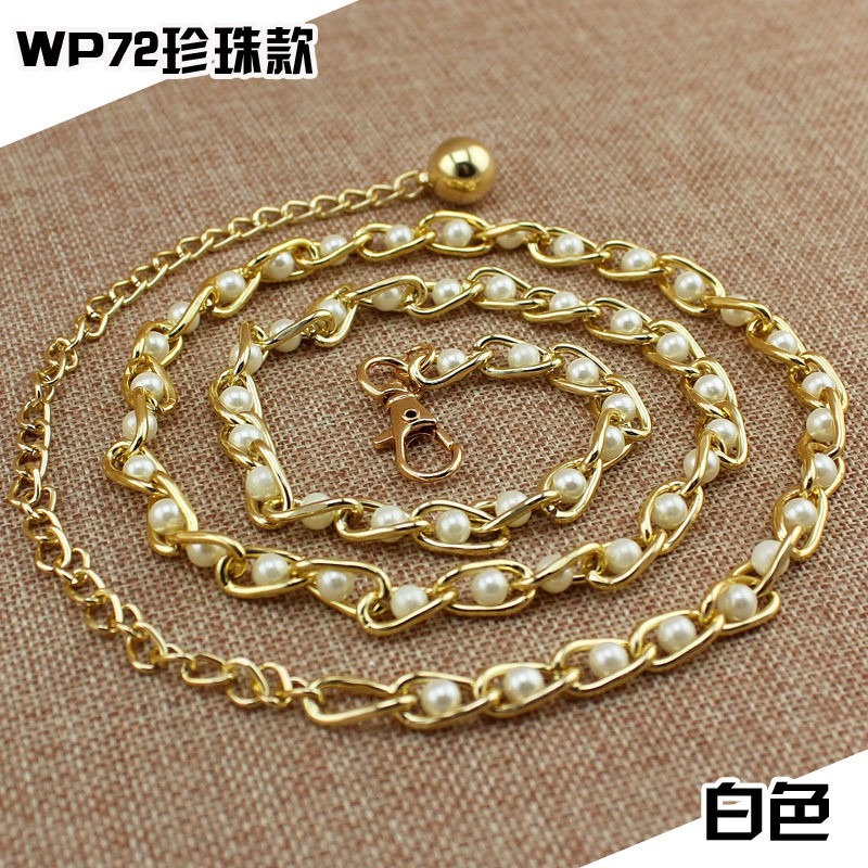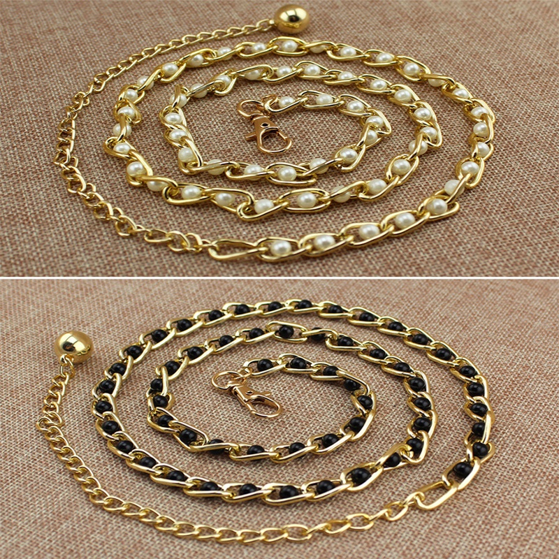 Women Pearl Metal Thin Waist Chain Belt Bead Tie Waistband