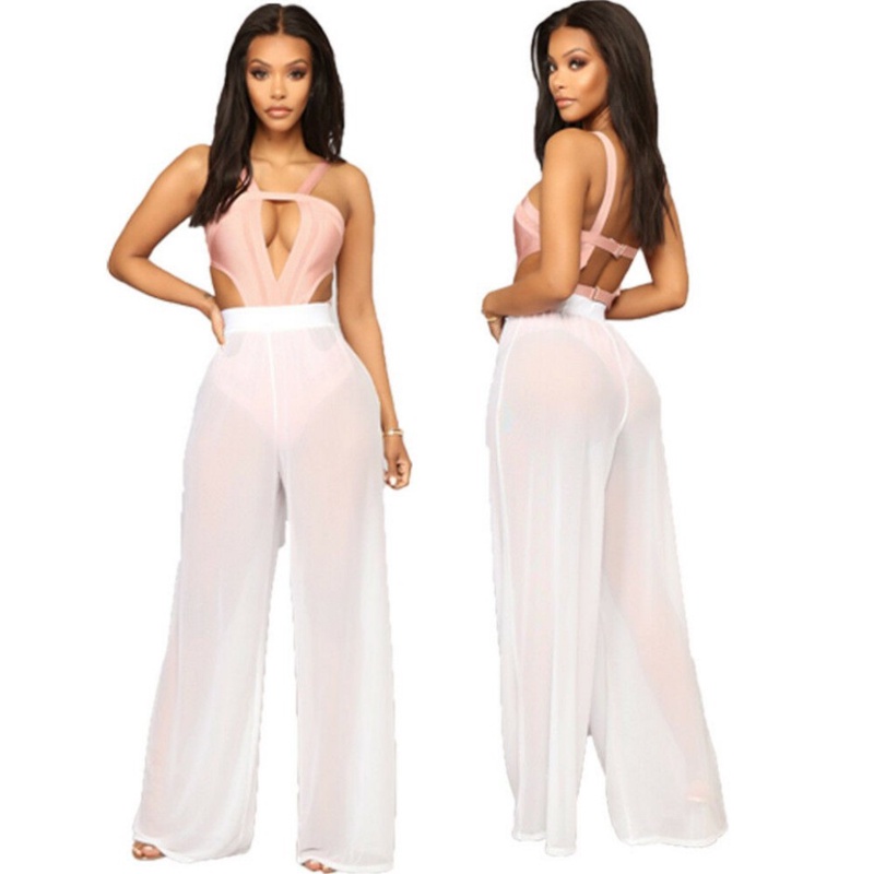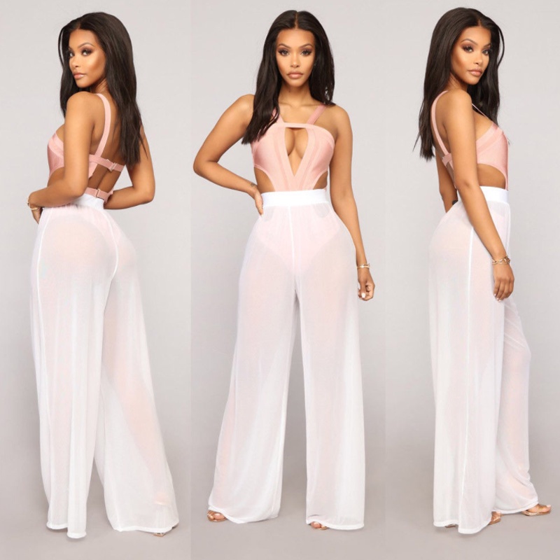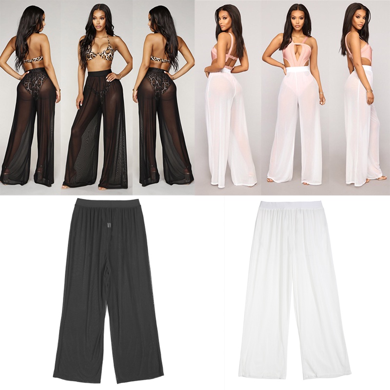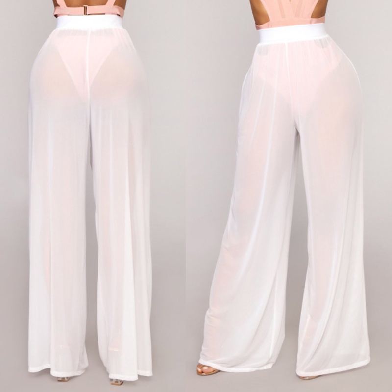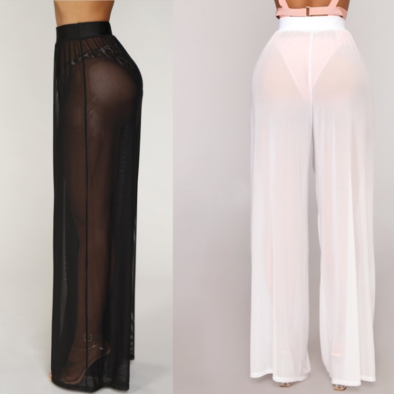 Women Sexy Transparent Trousers Summer Boho Wide High Waist Trousers Plus Size Beach Mesh Sheer Pants Cover Up Swimwear