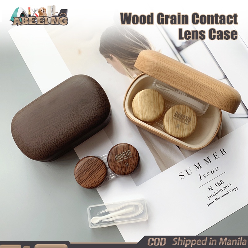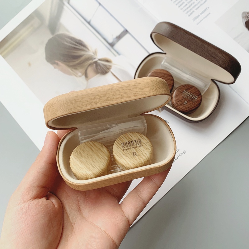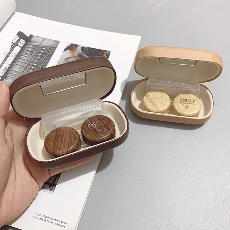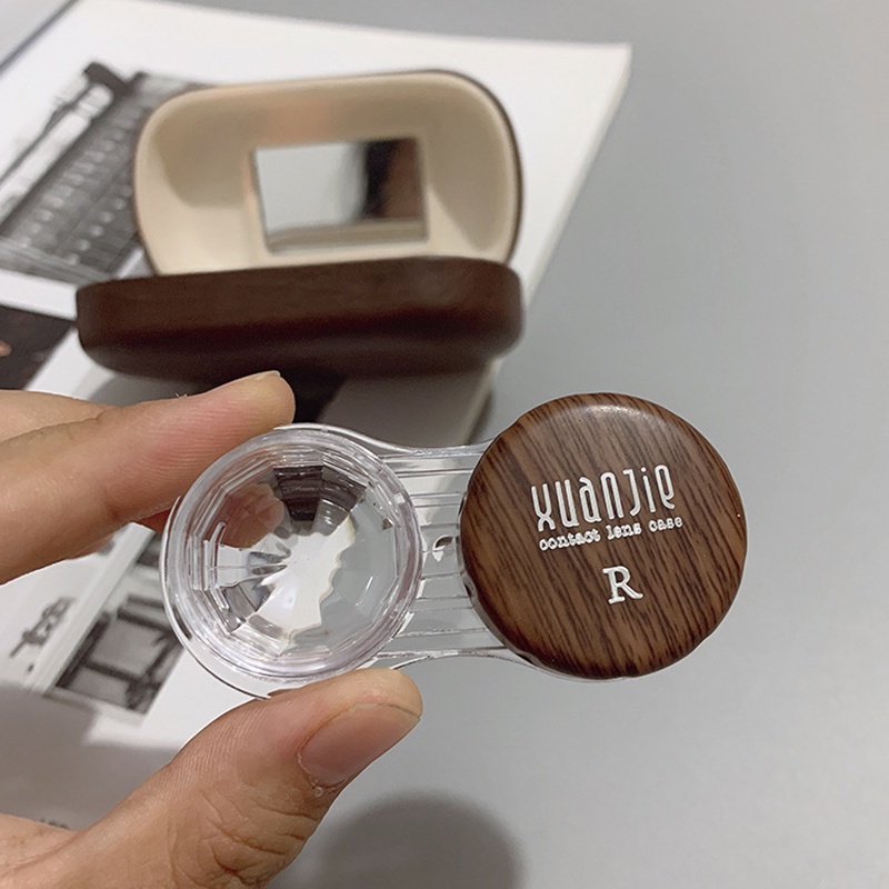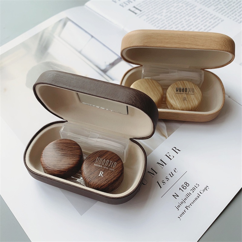 Wood Grain Contact Lens Case Set With Mirror Tweezers Remover Portable Contact Lens Box Container