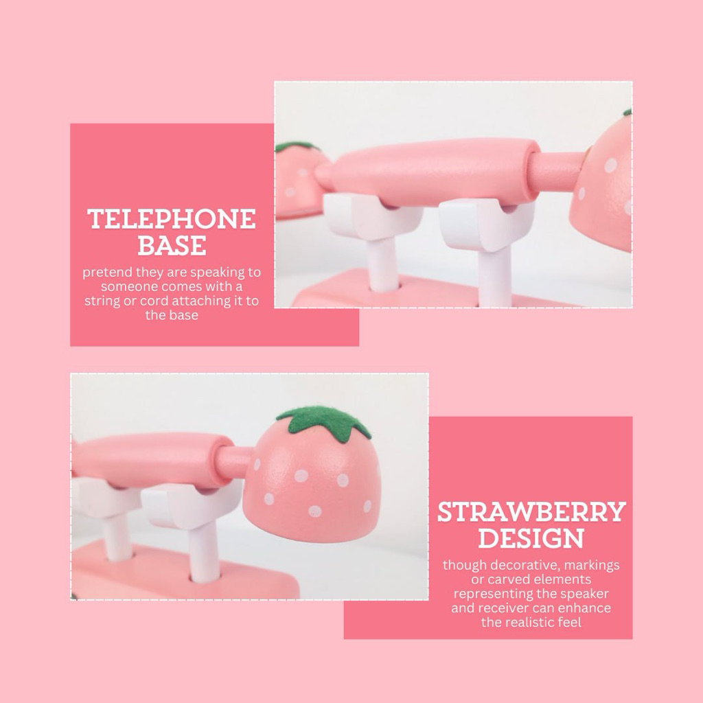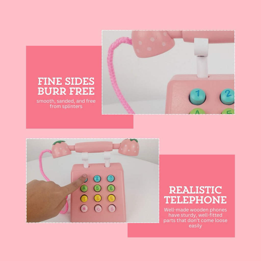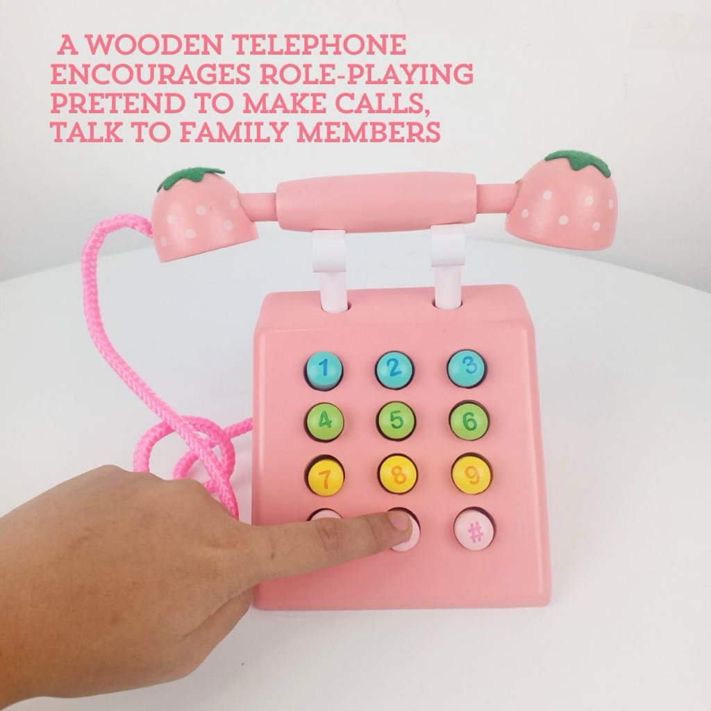 Wooden Strawberry Phone Toys Pretend Playset Children Girls Pink Telephone Call Dial Wooden toys