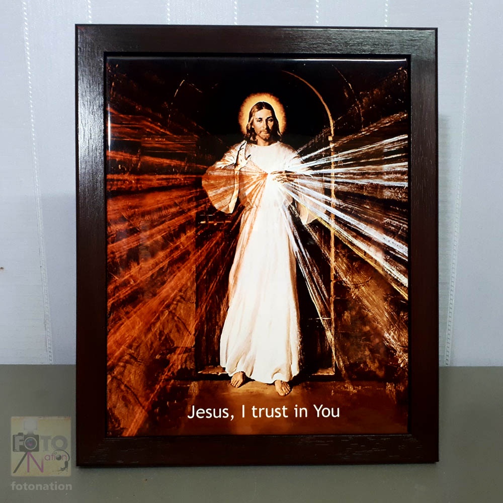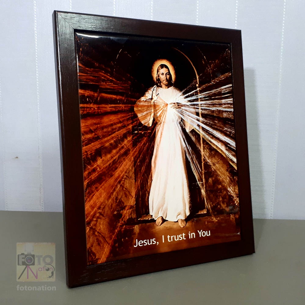 Wooden frame / printed ceramic tile Jesus Divine Mercy, 3 o'clock prayer, for wall and altar