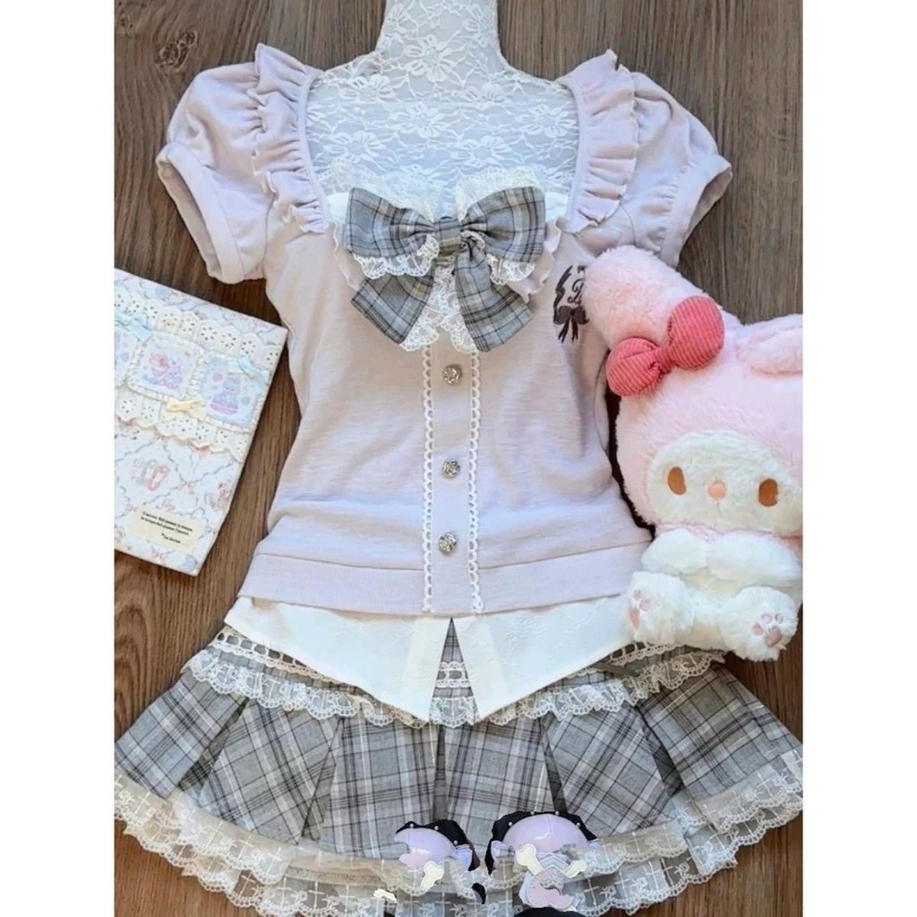 X-orange [Two-Piece Suit] Bow Pink Short-Sleeved Top+Gray Pleated Skirt Spring Summer New Style Fashion Casual Women's Clothing