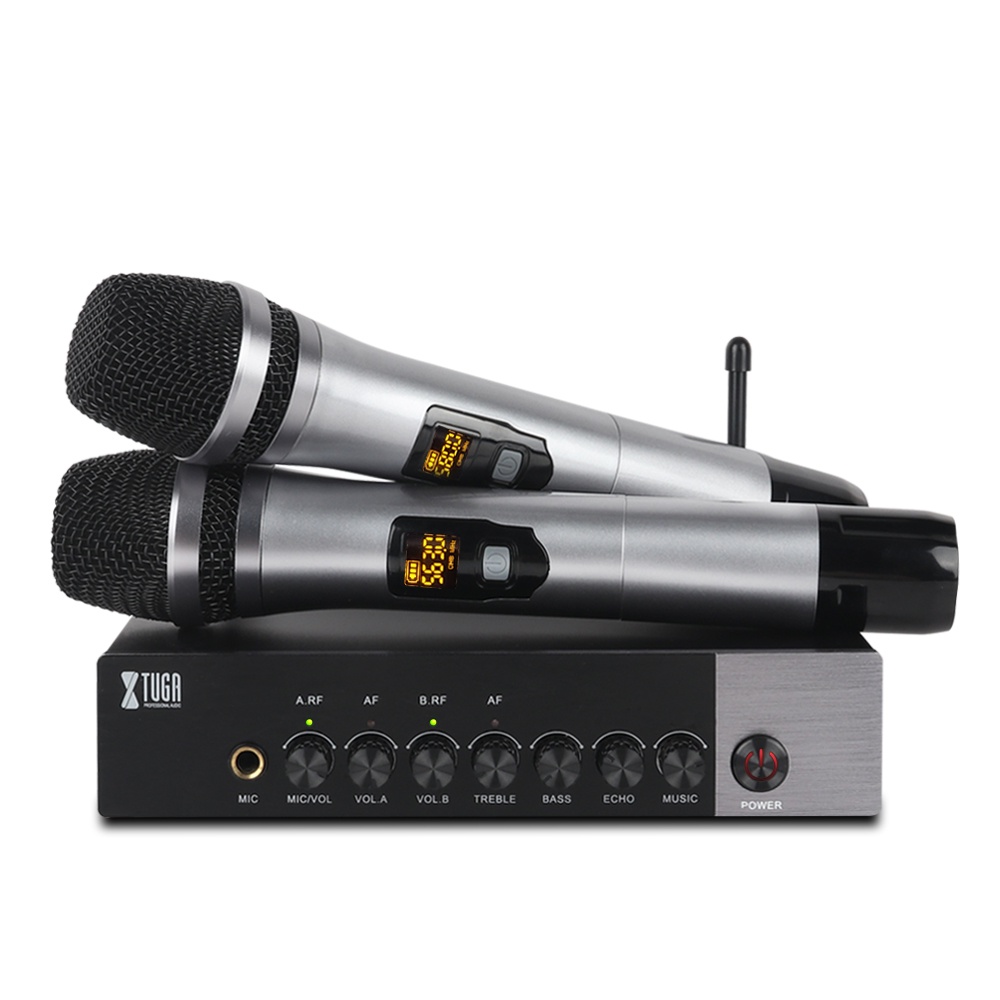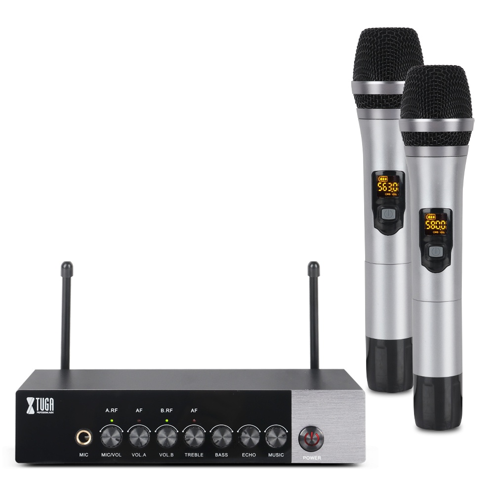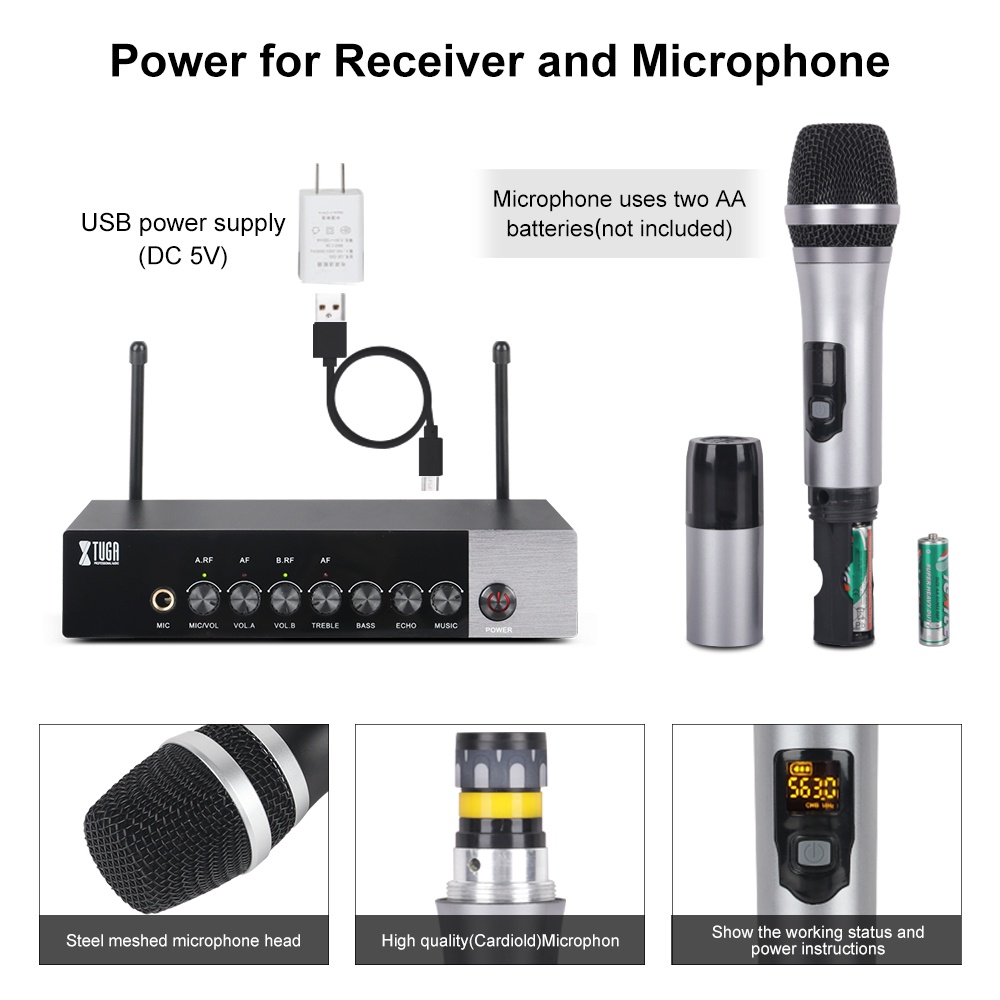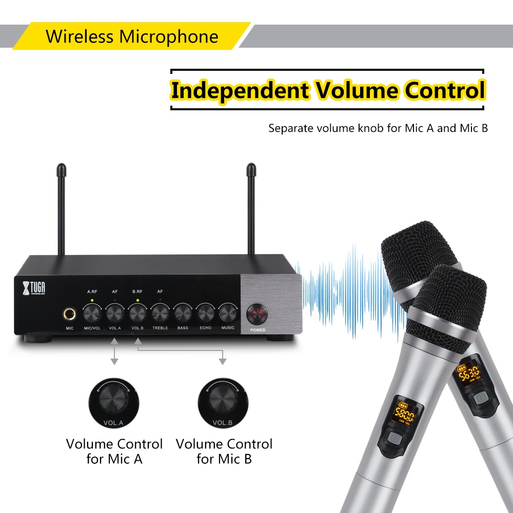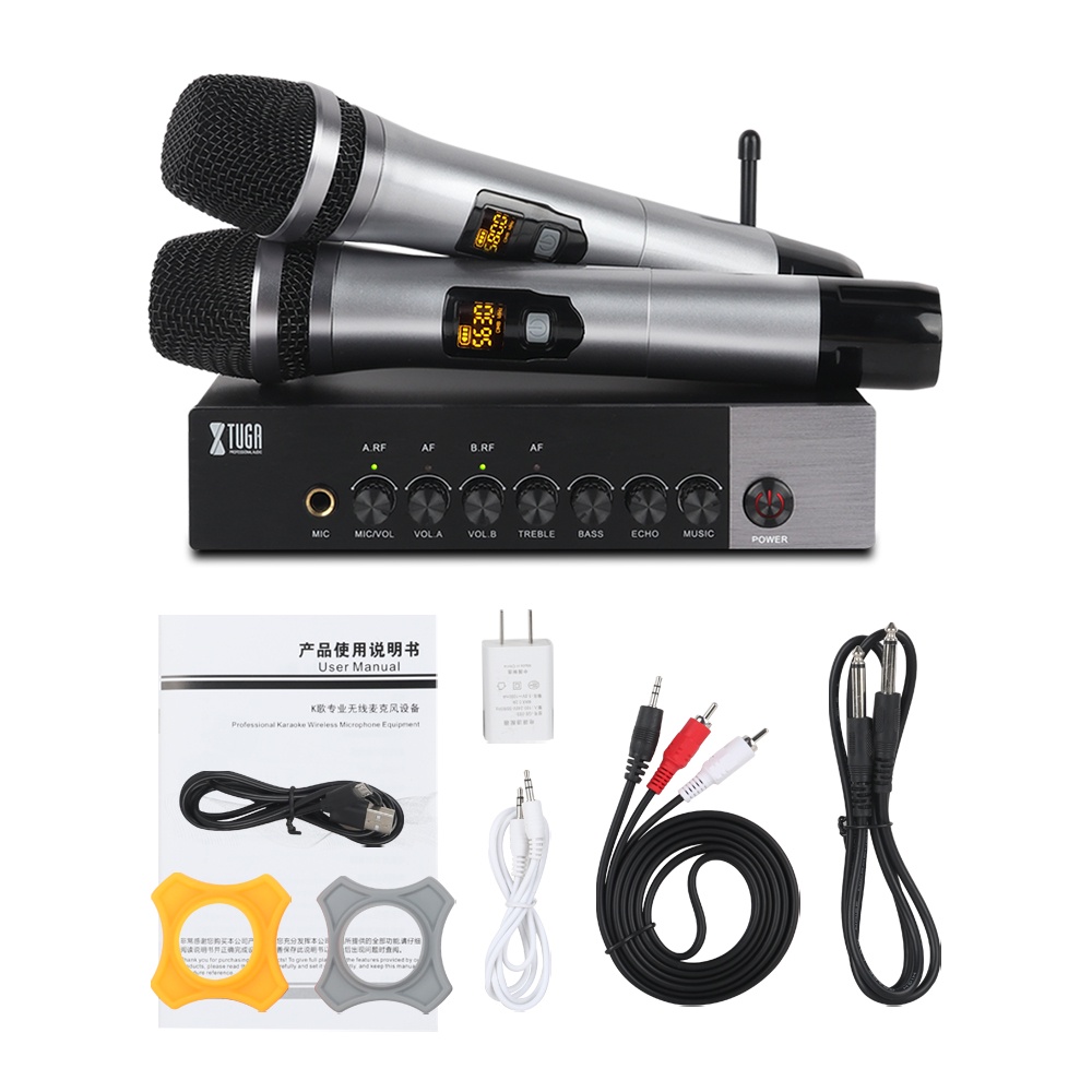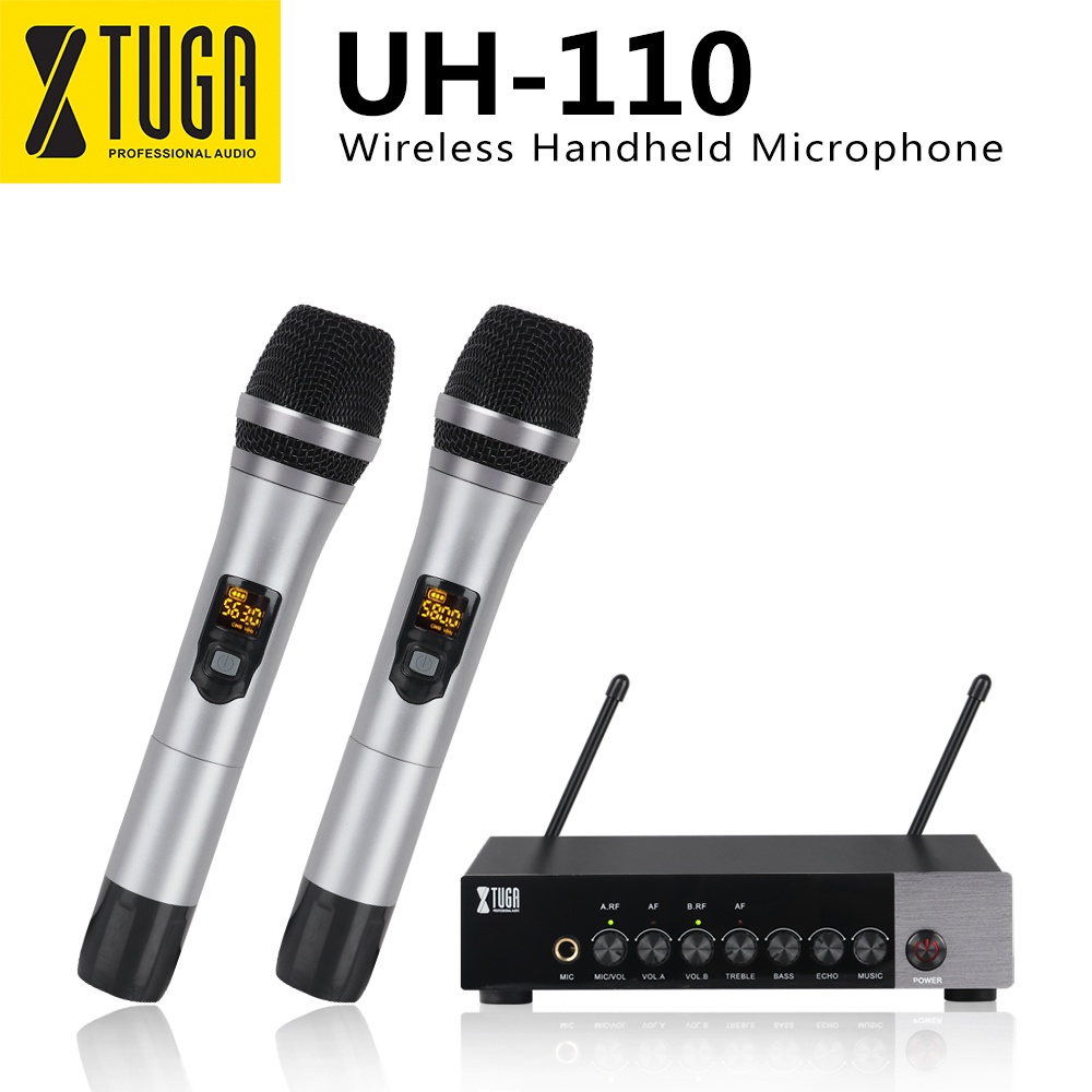 XTUGA Multi-function Wireless Microphone System UH-110 UHF Dual Channel Two Wireless Handheld Microphone, Easy-to-use, Bluetooth Microphone System with Treble/Bass/Echo Effect