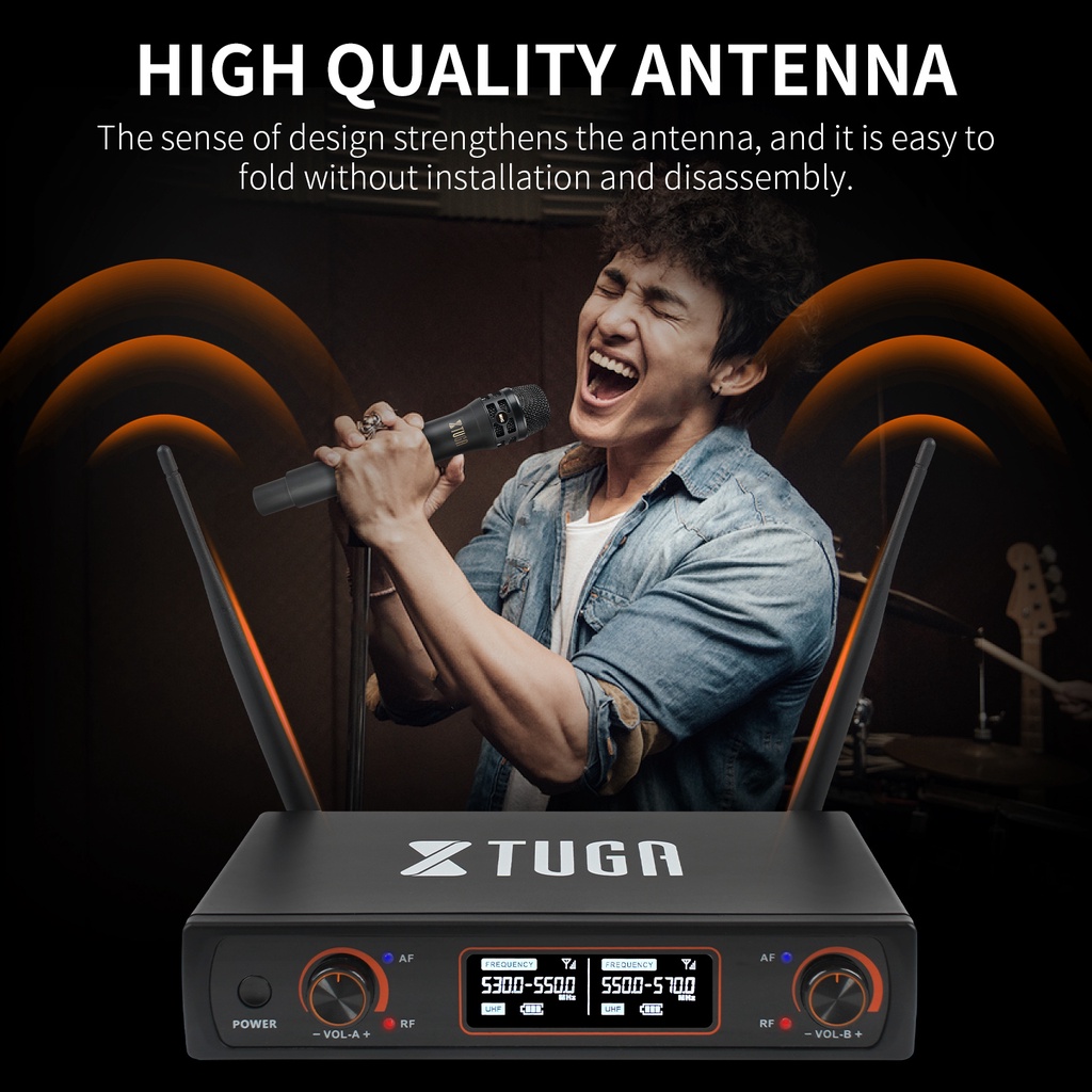 XTUGA T-010 2-Channel UHF Wireless Microphone System with 2 Hand-held Wireless Microphone Use for Stage, Church, Family Party, Wedding