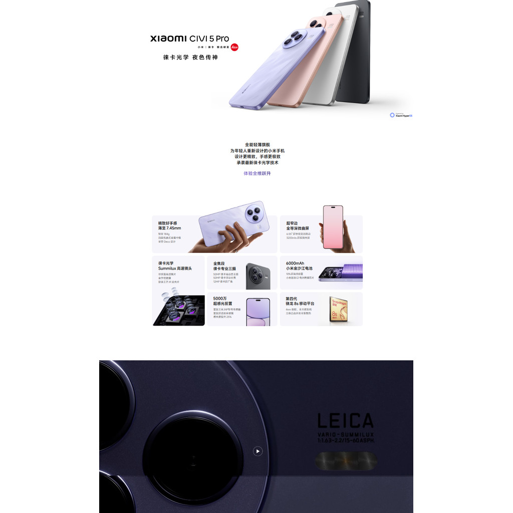 Xiaomi Civi 5 Pro 5G Mobile Phone 6.55 inches AMOLED 120Hz Snapdragon 8s Gen 4 50MP Triple Cameras 67W Fast Charge NFC
