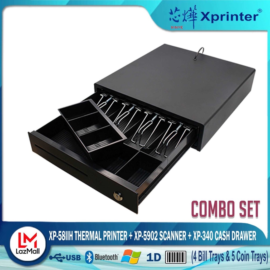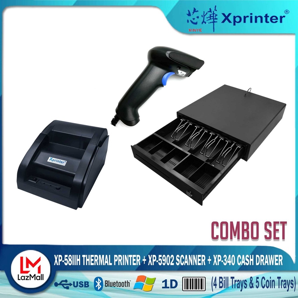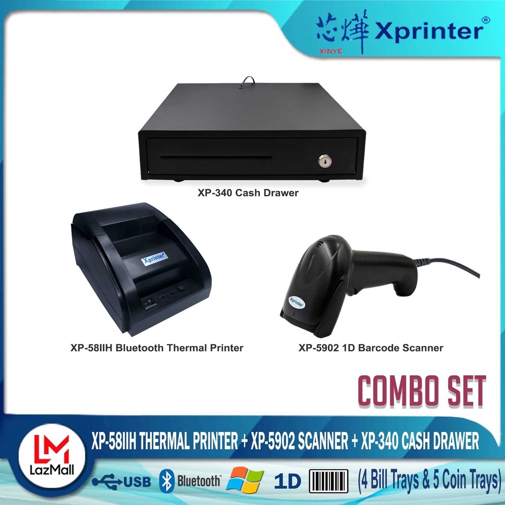 Xprinter XP- 58IID (Bluetooth) Thermal Cash Receipt Printer+ 340 Cash Drawer +9100 Scanner Combo Set