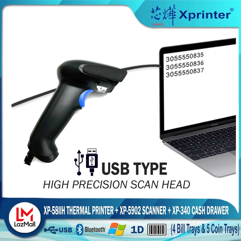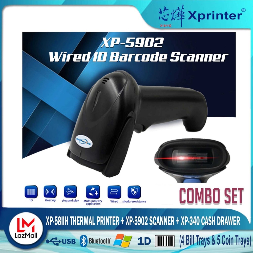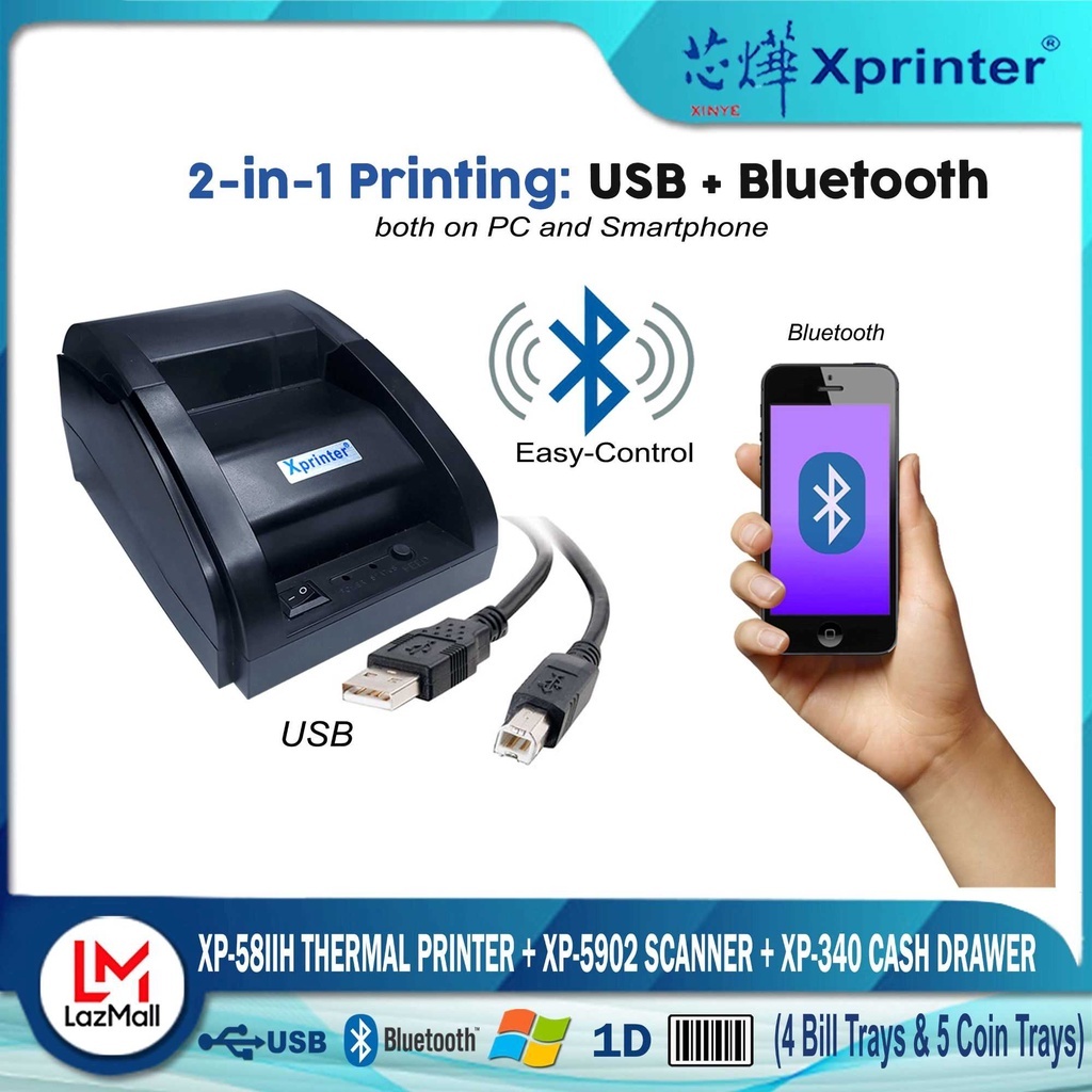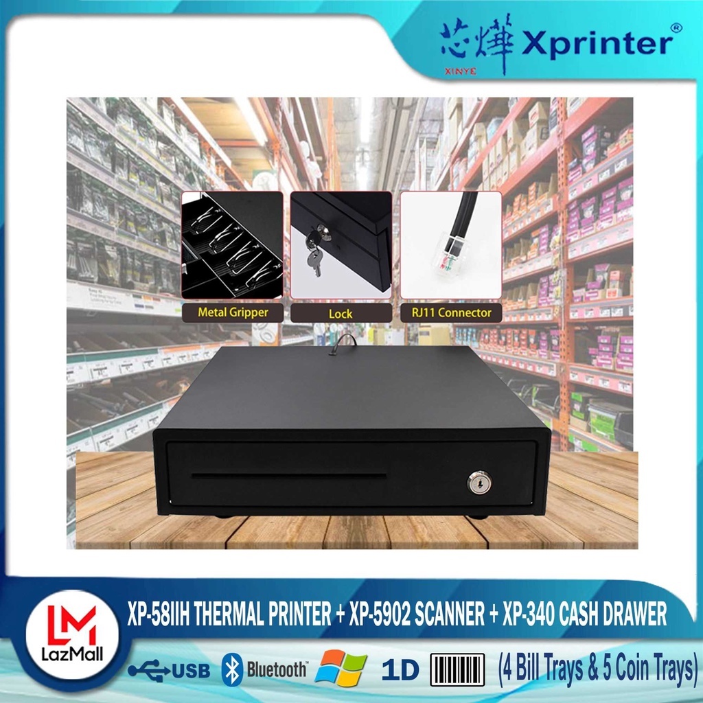Xprinter XP- 58IID (Bluetooth) Thermal Cash Receipt Printer+ 340 Cash Drawer +9100 Scanner Combo Set