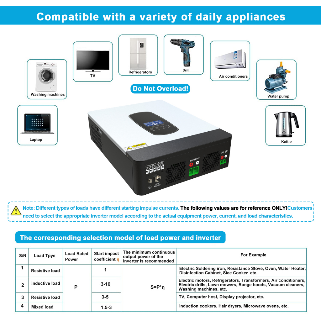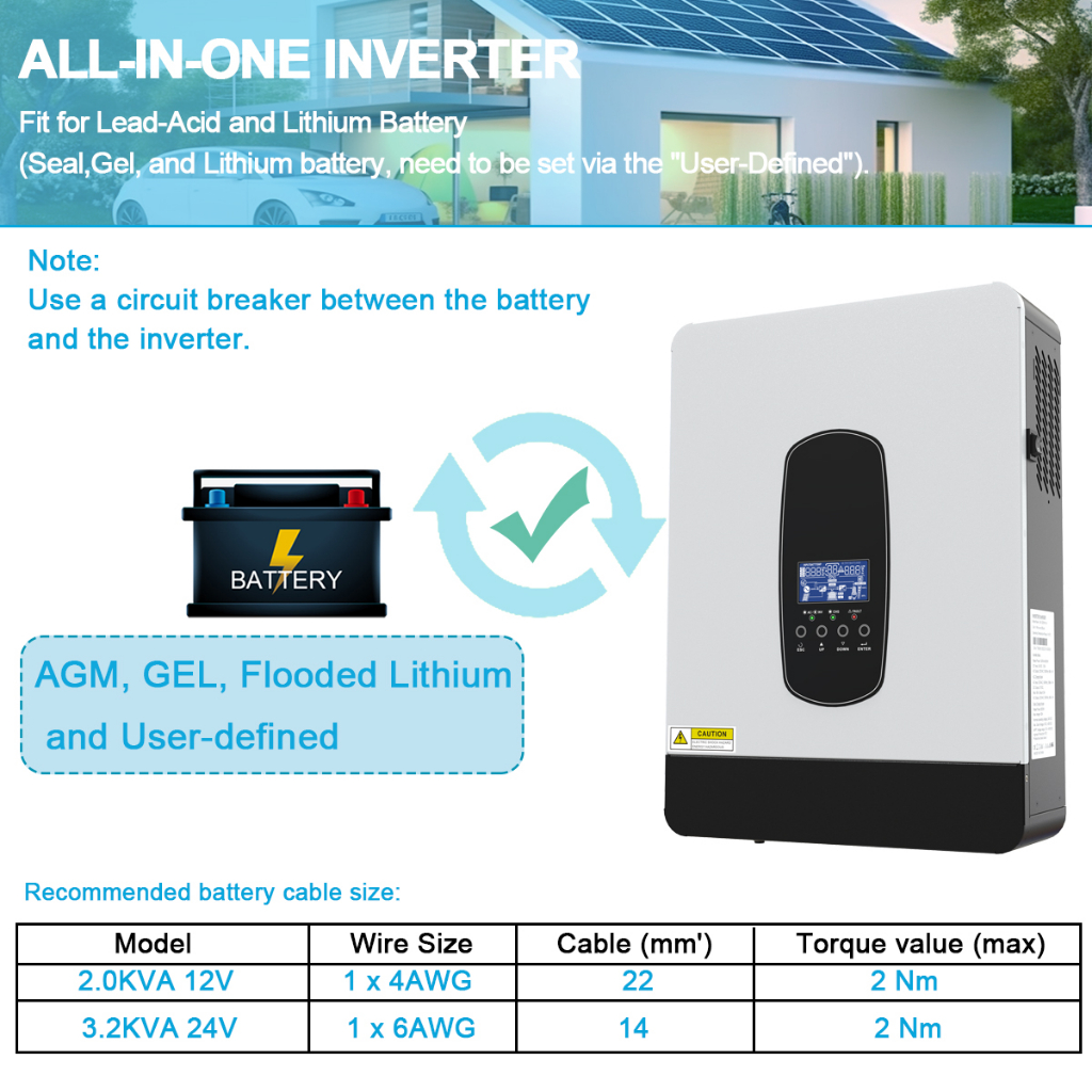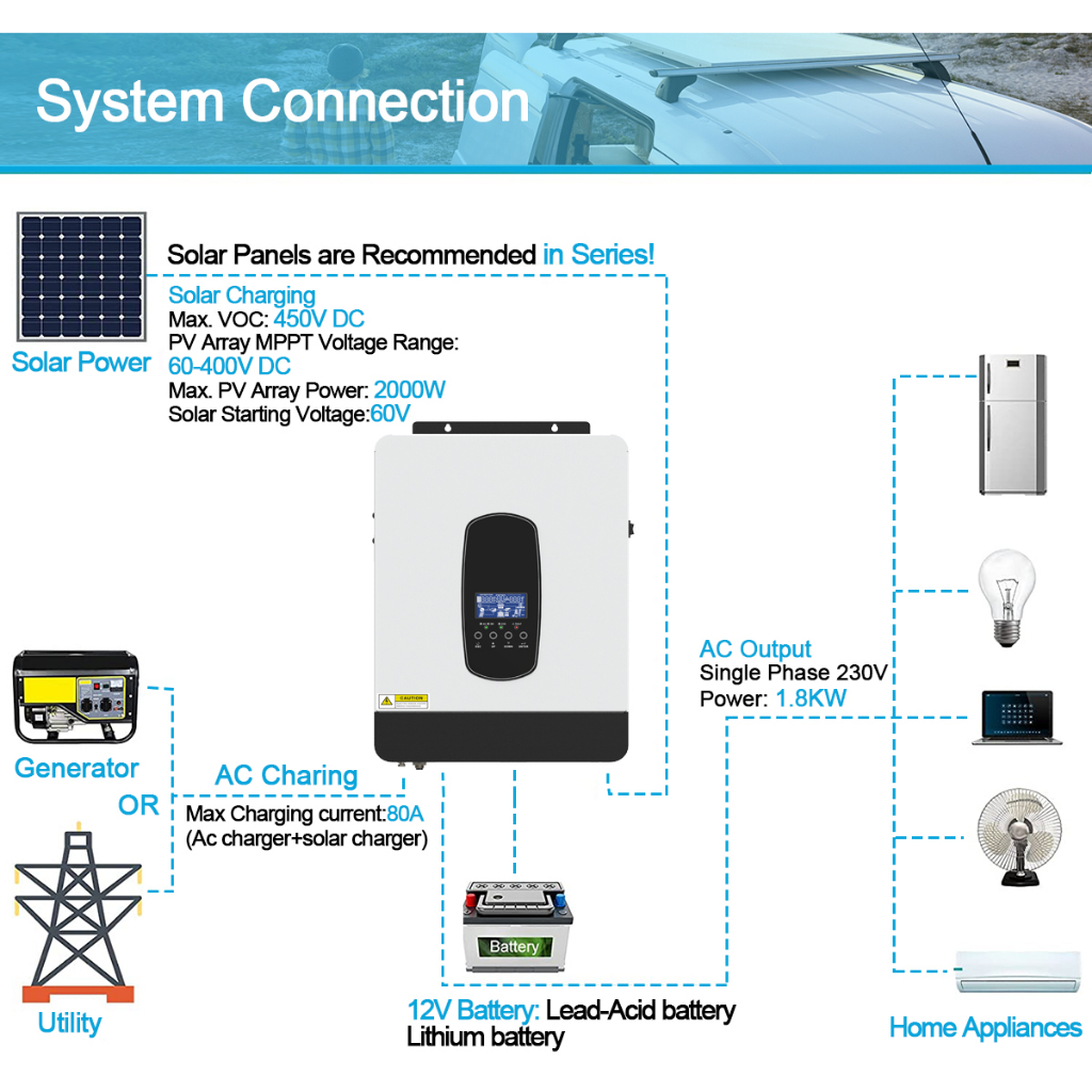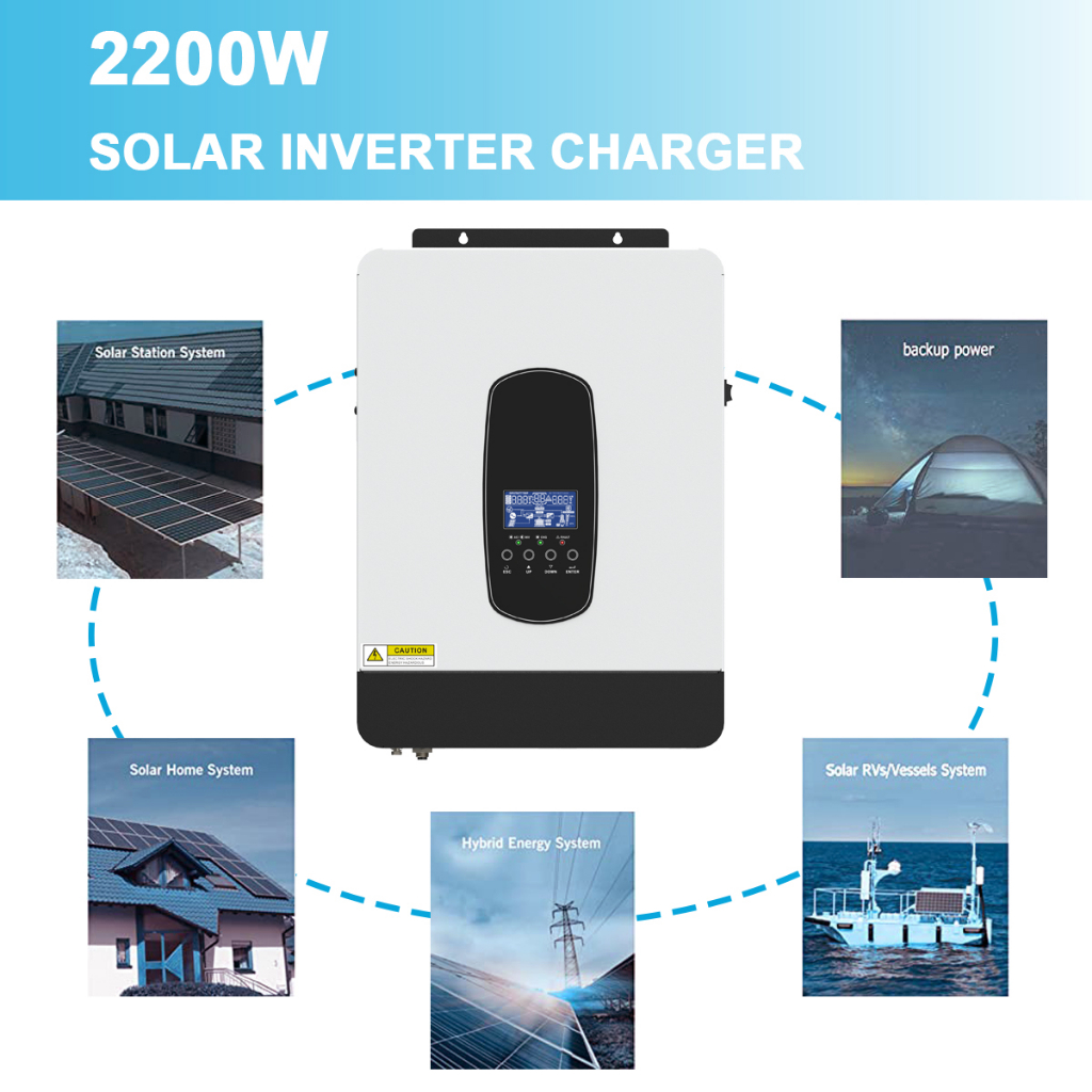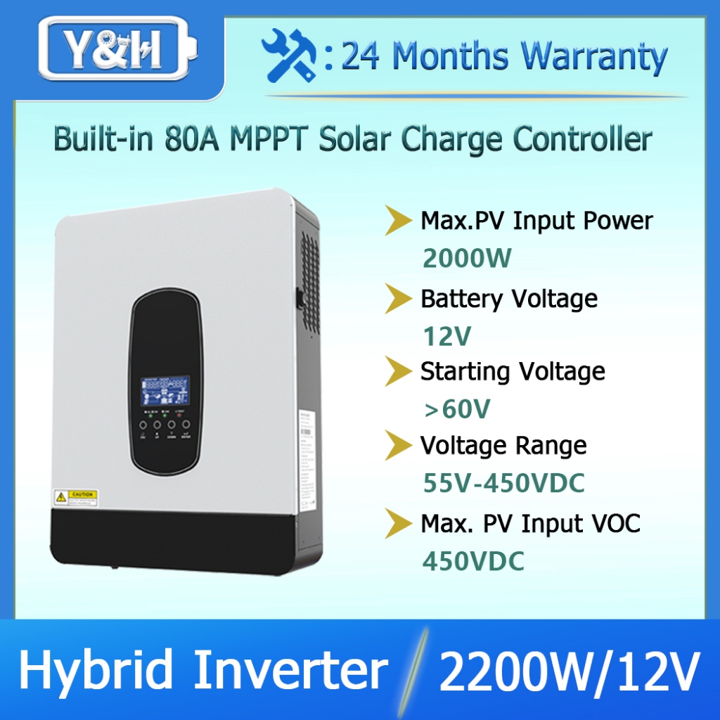 Y&H 2200W Solar Hybrid Inverter DC12V to AC230V, Off-Grid Pure Sine Wave Inverter with 80A MPPT Solar Charger + AC Charger,Max PV 2000W DC55-450V Input