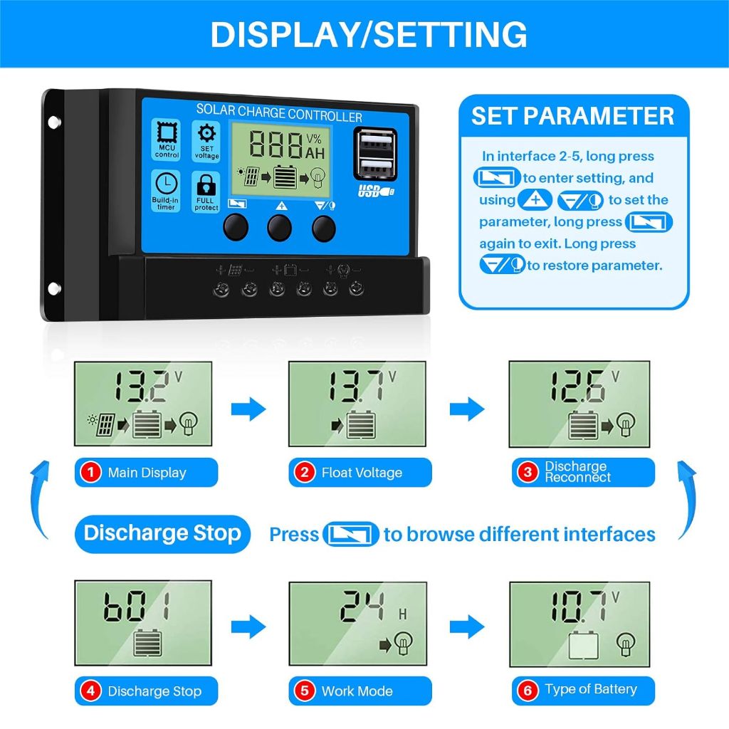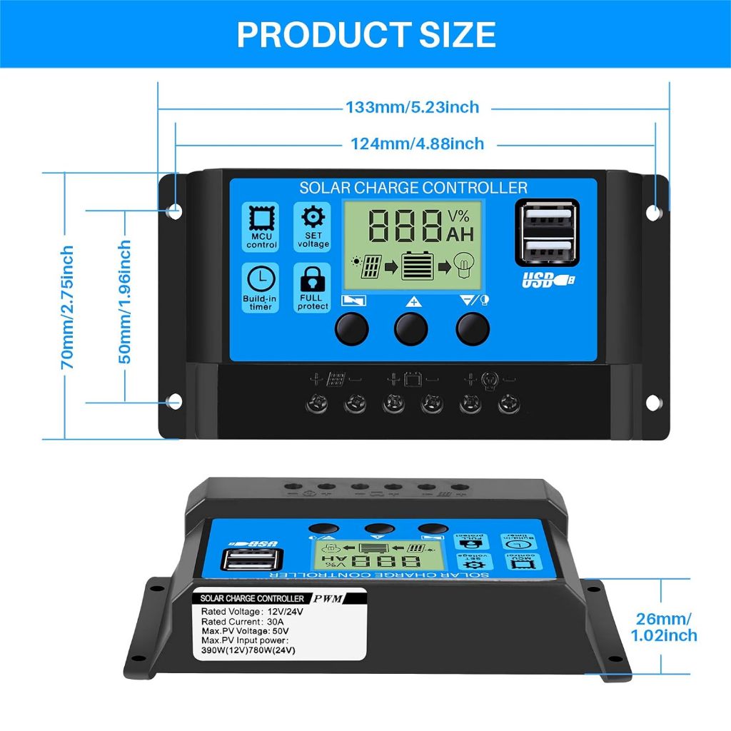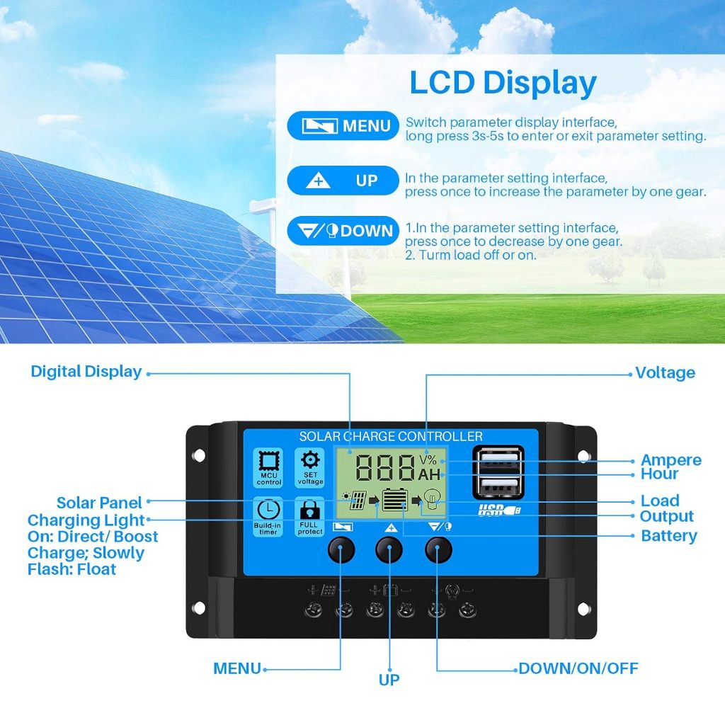 Y&H Solar Charge Controller 10A/20A/30A PWM 12V/24V Battery Regulator Solar Panel Controller LCD Display with Dual USB Port