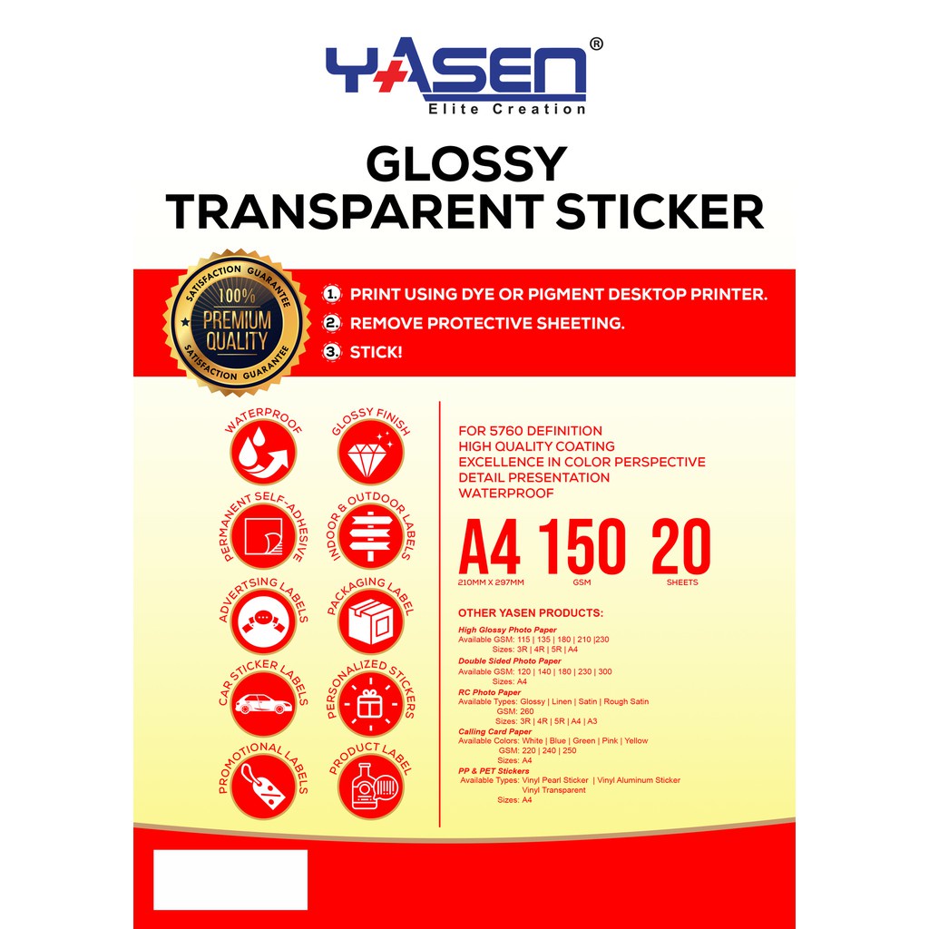 YASEN Transparent Vinyl Sticker A4 Size Label Sticker Paper 150GSM (20 Sheets/Pack)