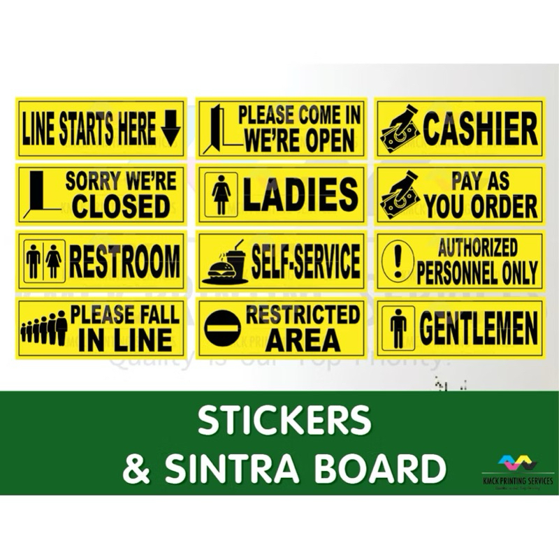 Yellow Sign|Please Fall in Line|Cashier|Self-service|Restricted Area|Line Start Here|Restroom