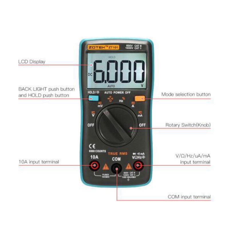 ZOTEK ZT102 Digital Multimeter Portable 6000 Counts Auto Ranging Multitester