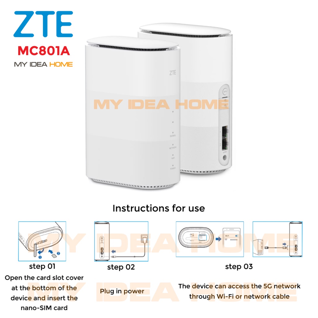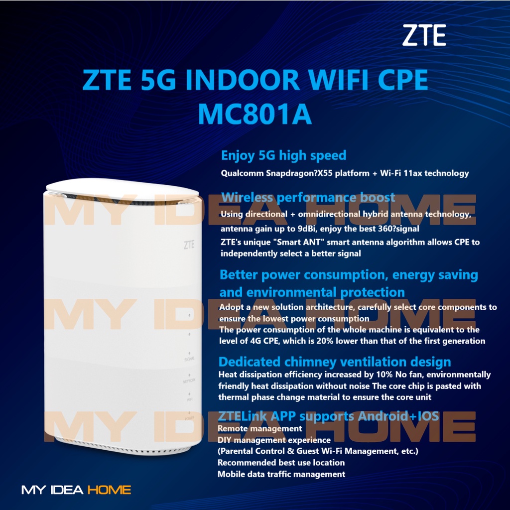 ZTE 5G CPE WiFi 6 Router LTE+5G EN-DC peak rate 4.6Gbps Wi-Fi 6, 2.4G&5G dual band, 2*2 MIMO MC801A