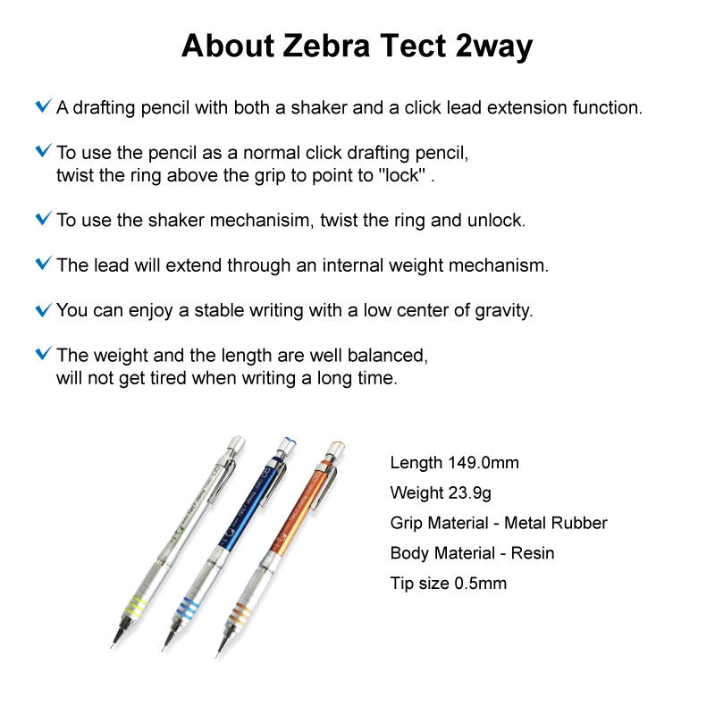 Zebra Tect 2way Drafting Pencil 0.5 mm Mechanical Pencil Shaker with Click Lead Extension Functionn Made in Japan Direct from Japan