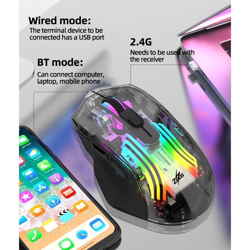 Zeus GD-008 Transparent RGB Mechanical Three Modes Gaming Mouse Bluetooth Wireless Wired Mouse