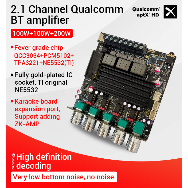 ZK-APTX1 Qualcomm Bluetooth digital amplifier board 2.1 channels 100Wx2/200W subwoofer chip QCC3034+ TPA3221