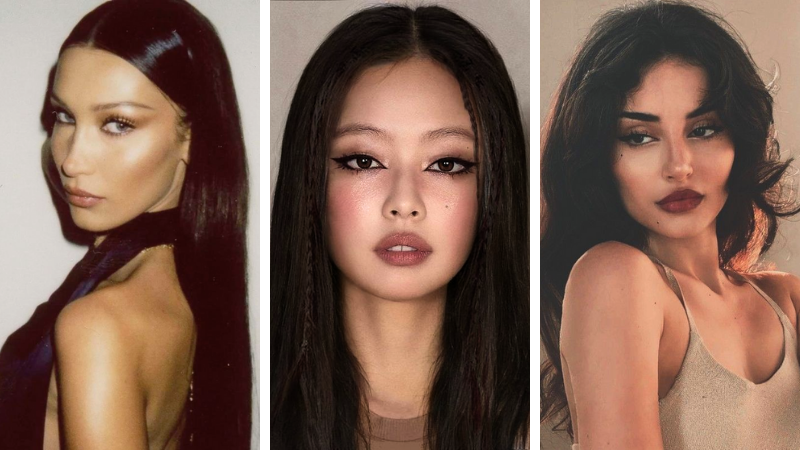 • Hair: Sleek low buns, voluminous waves, or long, straight hair parted sharply in the middle amplify the dark feminine silhouette