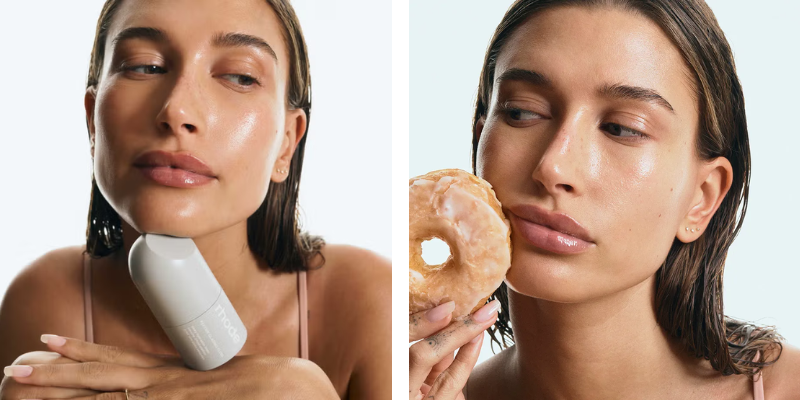 Then came the celebrity catalyst: Hailey Bieber and her beauty brand, Rhode. While peptides existed long before, Rhode’s launch pushed them into the viral spotlight through a combination of savvy strategies. The brand’s mass market appeal is undeniable; its identity is built around peptides, with products like the “Peptide Glazing Fluid” and “Peptide Lip Treatment” making the term inescapable. This, combined with the “glazed donut” effect—Hailey’s signature dewy complexion attributed to her peptide products—created a powerful and desirable aesthetic.
