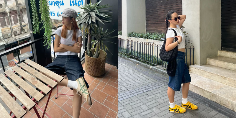 - The Look: Long, baggy denim shorts (jorts) hitting below the knee, paired with white scrunched socks and yellow Onitsuka Tiger.