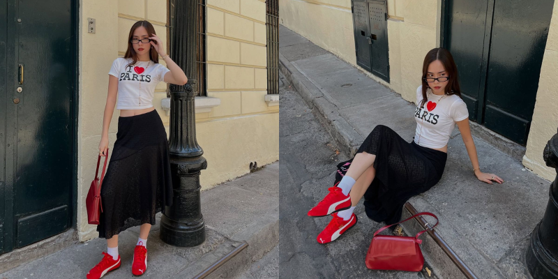 - The Look: A floor-length denim or silk maxi skirt paired with Onitsuka Tigers.
