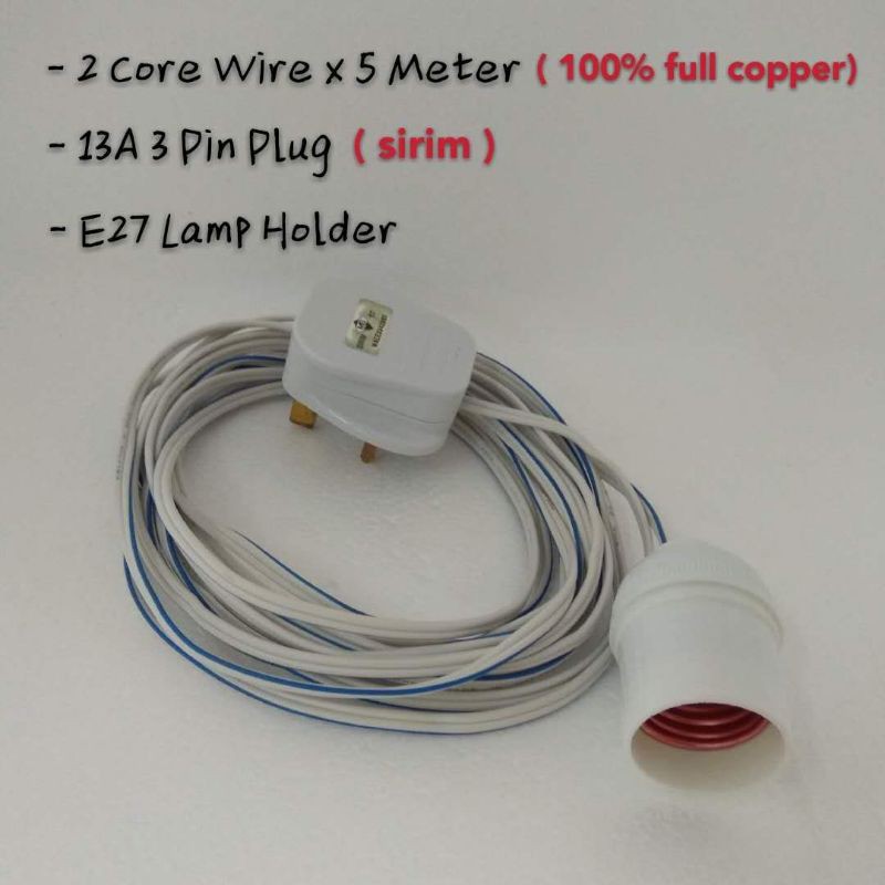 cable twin flat wire 2 core x 5 meter complete set with 3 pin plug & E27 lamp holder