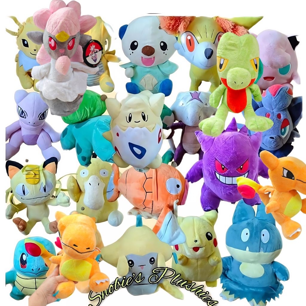 mimikyu gengar togepi bulbasaur rowlet evee pikachu pokemon characters stuffed toys