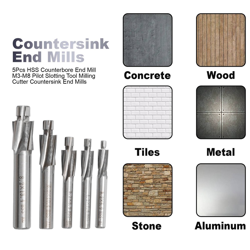 haidaai01.ph*5Pcs HSS Counterbore End Mill M3-M8 Pilot Slotting Tool Milling Cutter Countersink End Mills
