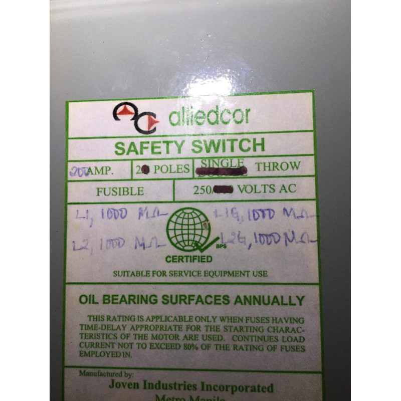 heavy-duty alliedcor fuse box/safety switch 200amps, 2 pole, single throw w/2pcs enclosed fuse!!