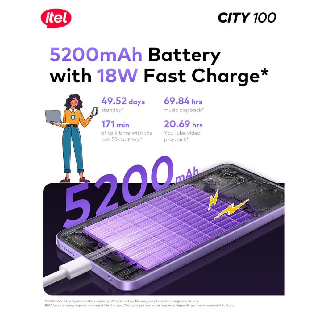 itel CITY 100 24GB (8+16GB Extended RAM) + 128GB ROM | IP64 Drop Resistance | 7.65mm" Slim | 5200mAh