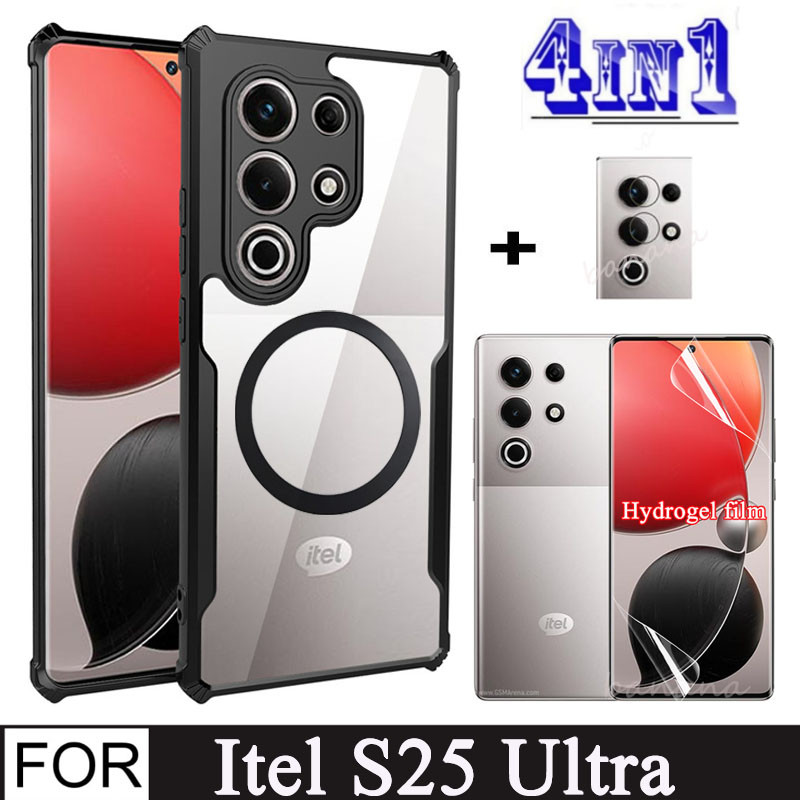 itel S25 Ultra Shockproof Phone Case With Magnetic Wireless Charging Sticker for itel S23+ 4 in 1 Full Transparent Hydrogel Soft Film Screen Protector