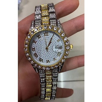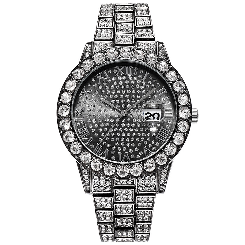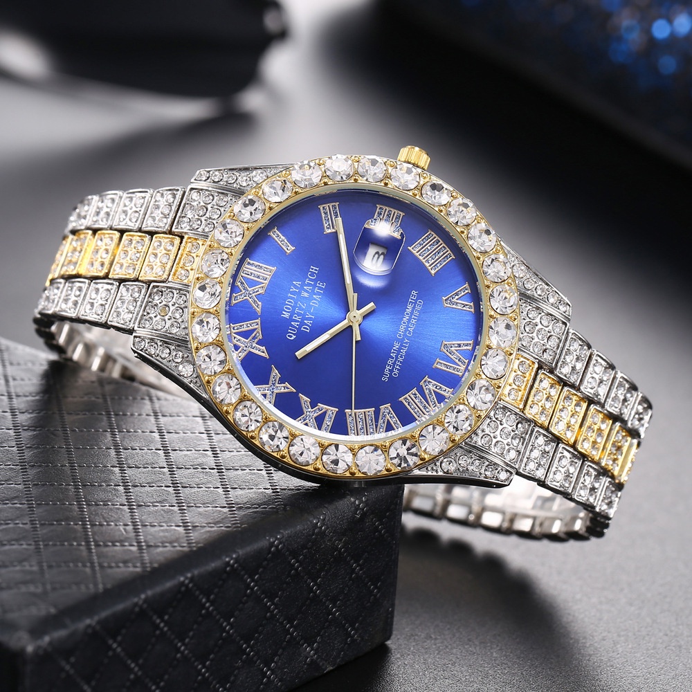 new rhinestone magnifying glass calendar full diamond face Roman scale alloy steel band watch starry hip-hop men's watch