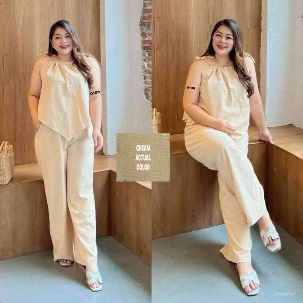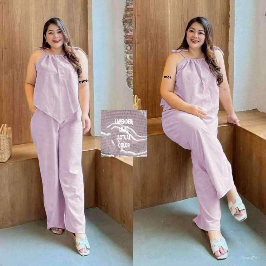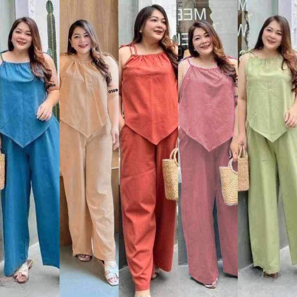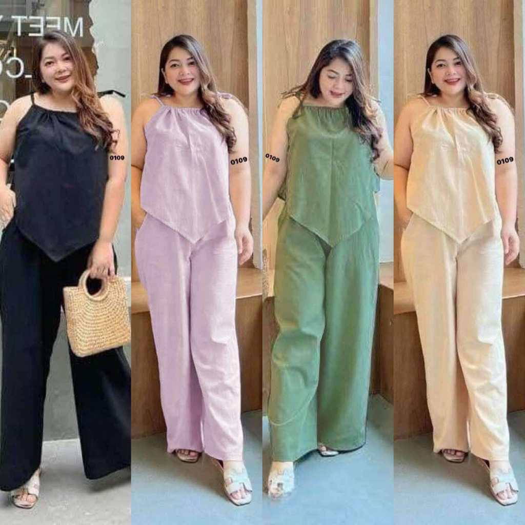 PLUS SIZE GWEN COORDINATES TRIANGLE BOW TIE TOP PAIR W/ LONG TROUSERS/PANTS WITH SIDE POCKETS