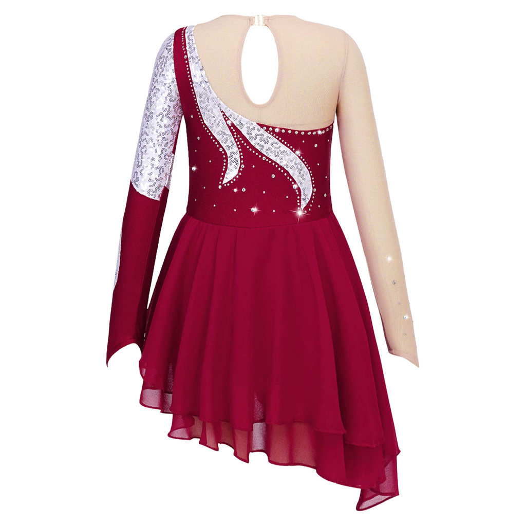Ice Figure Skating Dress For Girls Irregular Skirt Long-sleeved Beaded Roller Skating Skirt