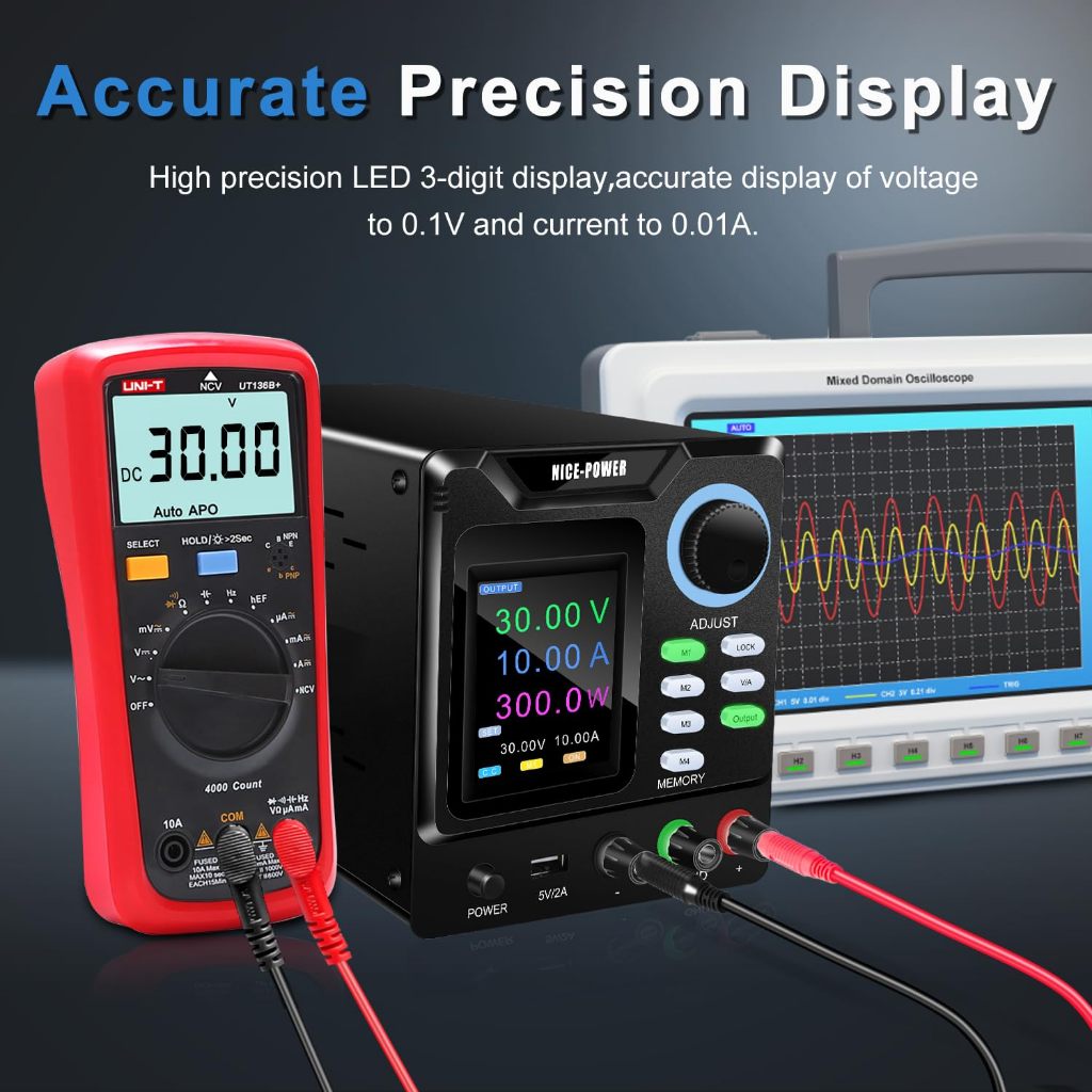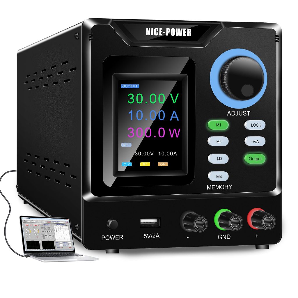 NICE-POWER DC Power Supply Variable, 30V 10A Adjustable Regulated Lab Bench Power Supply 4-Digit Color LCD Display with PC Software Memory Storage